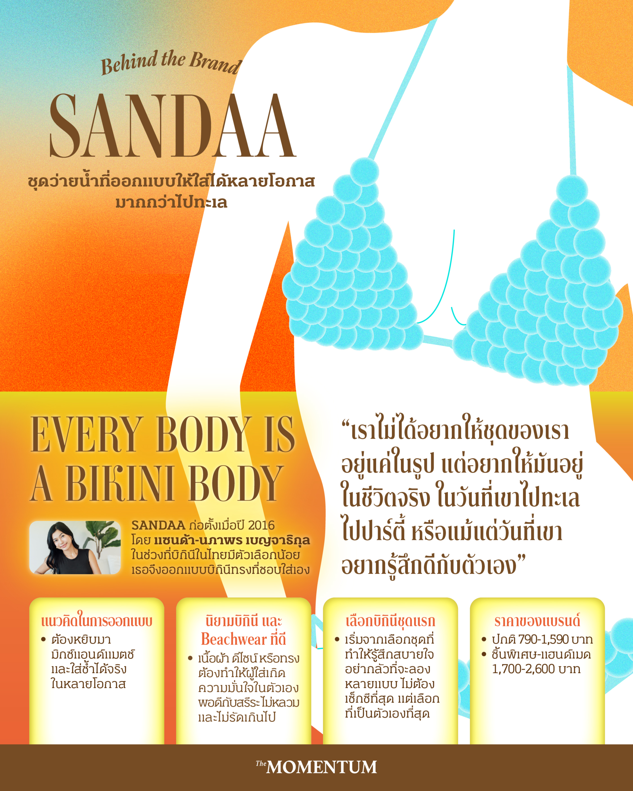 นอกจากอยากให้ทุกคนได้ลองใส่บิกินี The Momentum ได้ชวนแซนด้าพูดคุยถึงเทรนด์ตอนนี้กับแนวคิดการออกแบบบิกินี ที่ตั้งใจให้คนหยิบมาใส่ได้บ่อย ใส่ได้หลายงานมากกว่าแค่ทะเล ไปจนถึงทำอย่างไรไม่ให้คนมองบิกินีกับบีชแวร์กลายเป็นฟาสต์แฟชั่นที่ใส่ถ่ายรูปแค่ครั้งเดียวแล้วเก็บเข้าตู้