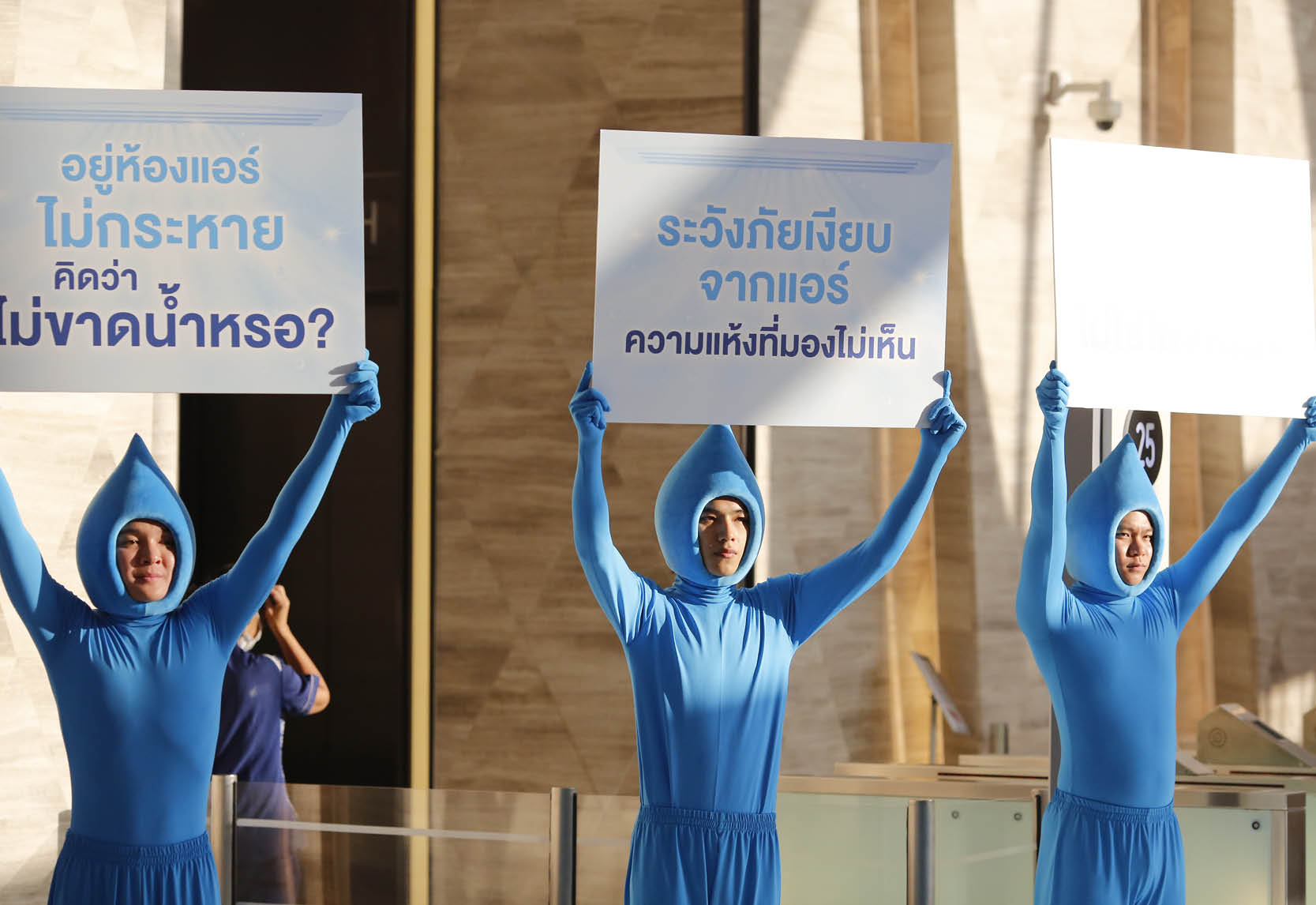 อย่างไรก็ตามการนั่งอยู่ในห้องแอร์เป็นเวลานาน ประชุมต่อเนื่อง และดื่มน้ำไม่เพียงพอ ก็อาจเพิ่มความเสี่ยงให้เกิดภาวะขาดน้ำได้เช่นกัน เพราะจริงๆ แล้วร่างกายสามารถสูญเสียน้ำได้ตลอดเวลาผ่านผิวหนัง การหายใจ โดยเฉพาะอย่างยิ่ง ความแห้งจากเครื่องปรับอากาศ