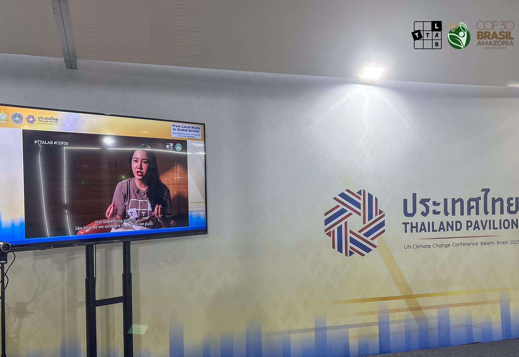 ปีนี้ทาง TTALAB ยังได้ส่งคลิปวิดีโอ Talk Session ในหัวข้อ ‘From Local Roots to Global Action: How Thailand’s Culture and Creativity Drive Urban Adaptation’ ไปนำเสนอที่ COP30 ซึ่งรวบรวมมุมมองจากผู้แทนจากหลายสาขา ตั้งแต่พีเจ-หริสวรรณ ทีมผู้พัฒนาโครงการ ผู้เชี่ยวชาญด้านความยั่งยืน พรพรหม ณ.ส. วิกิตเศรษฐ์ ที่ปรึกษาผู้ว่าราชการกรุงเทพมหานครและผู้บริหารด้านความยั่งยืน, อูน-ชนิสรา วงศ์ดีประสิทธิ์ CEO of Brunch Time ไปจนถึงศิลปินและนักขับเคลื่อนสิ่งแวดล้อมอย่าง เอิ๊ต-ภัทรวี ศรีสันติสุข และตัวแทนเยาวชนจาก Thailand Youth Climate Council