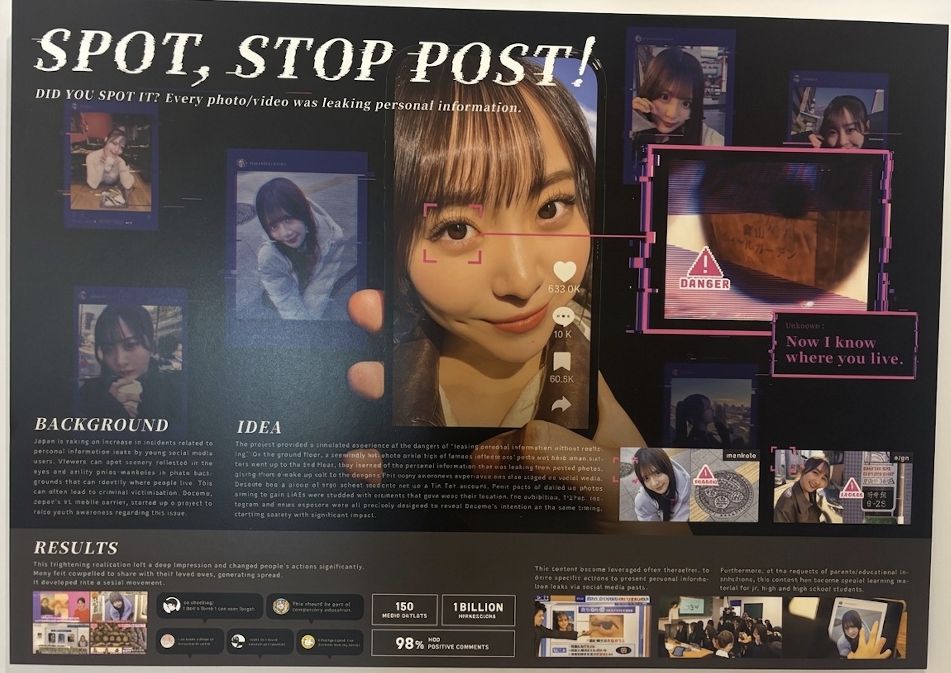 ความน่ากังวลคือ ปรากฏการณ์นี้กำลังเกิดขึ้นมากขึ้นในกลุ่มคนรุ่นใหม่ จนทำให้ภาคส่วนอย่างอุตสาหกรรมโทรคมนาคมญี่ปุ่นเริ่มขยับตัว สื่อสารเรื่องนี้อย่างจริงจังมากขึ้น แคมเปญนี้เลือกจะไม่บอกตรงๆ ว่าอะไรควรหรือไม่ควร แต่สร้างประสบการณ์ให้คนค่อยๆ รู้สึกด้วยตัวเอง เริ่มจากนิทรรศการภาพถ่ายของอินฟลูเอนเซอร์ที่ดูเหมือนเป็นภาพไลฟ์สไตล์ทั่วไป ก่อนที่เมื่อเดินดูต่อไป ผู้ชมจะเริ่มสังเกตเห็นว่า ภาพเหล่านั้นกำลังเปิดเผยข้อมูลส่วนตัวทีละน้อยมากกว่าที่คิด