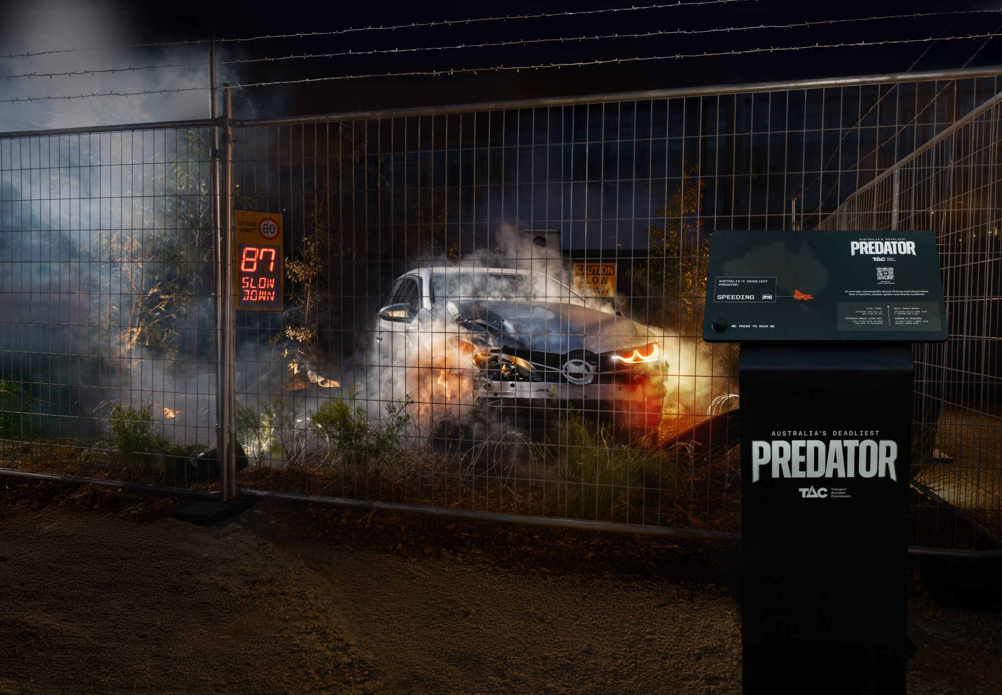โดยแคมเปญนี้ถูกจัดขึ้นในรูปแบบของนิทรรศการสาธารณะขนาดใหญ่ใจกลางเมืองเมลเบิร์น พร้อมจำลองกรงสวนสัตว์ ผู้เข้าชมจะได้เห็นซากรถยนต์ที่พังยับเยินจากอุบัติเหตุที่เกิดขึ้นจากการขับรถเร็วเกินกำหนด และเมื่อผู้ชมสแกน QR Code จะได้ฟังเสียงเครื่องยนต์และความเร็วของรถ ที่ถูกปรับให้คล้ายกับสัตว์ที่ดุร้าย เช่น งู เสือ ฉลาม เพื่อสื่อว่าสัตว์ที่อันตรายที่สุดในออสเตรเลีย คือรถยนต์ที่วิ่งด้วยความเร็วสูงนั่นเอง