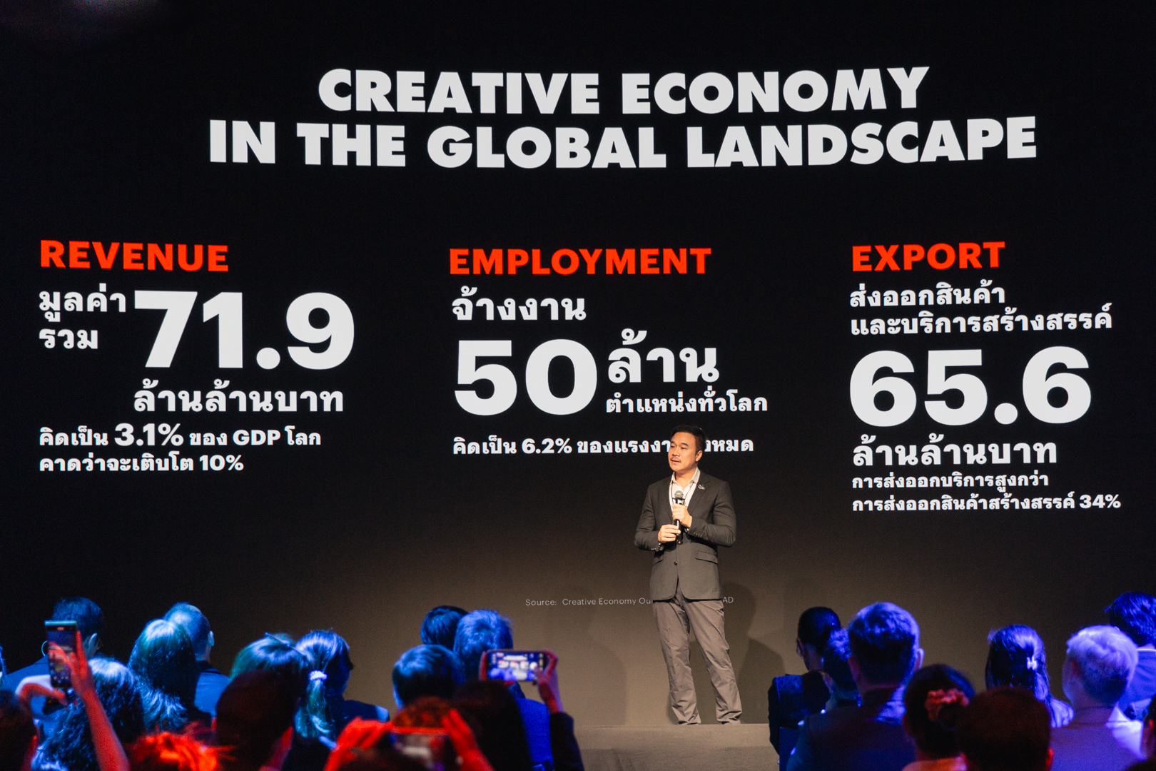 ด้าน ดร.ชาคริต พิชญางกูร ผู้อำนวยการ CEA ระบุว่า อุตสาหกรรมสร้างสรรค์ไทยมีมูลค่าสูงถึง 1.44 ล้านล้านบาท คิดเป็น 8.01% ของ GDP สร้างรายได้จากการส่งออกกว่า 3.91 แสนล้านบาท และมีนักสร้างสรรค์เกือบ 1 ล้านคนในระบบ