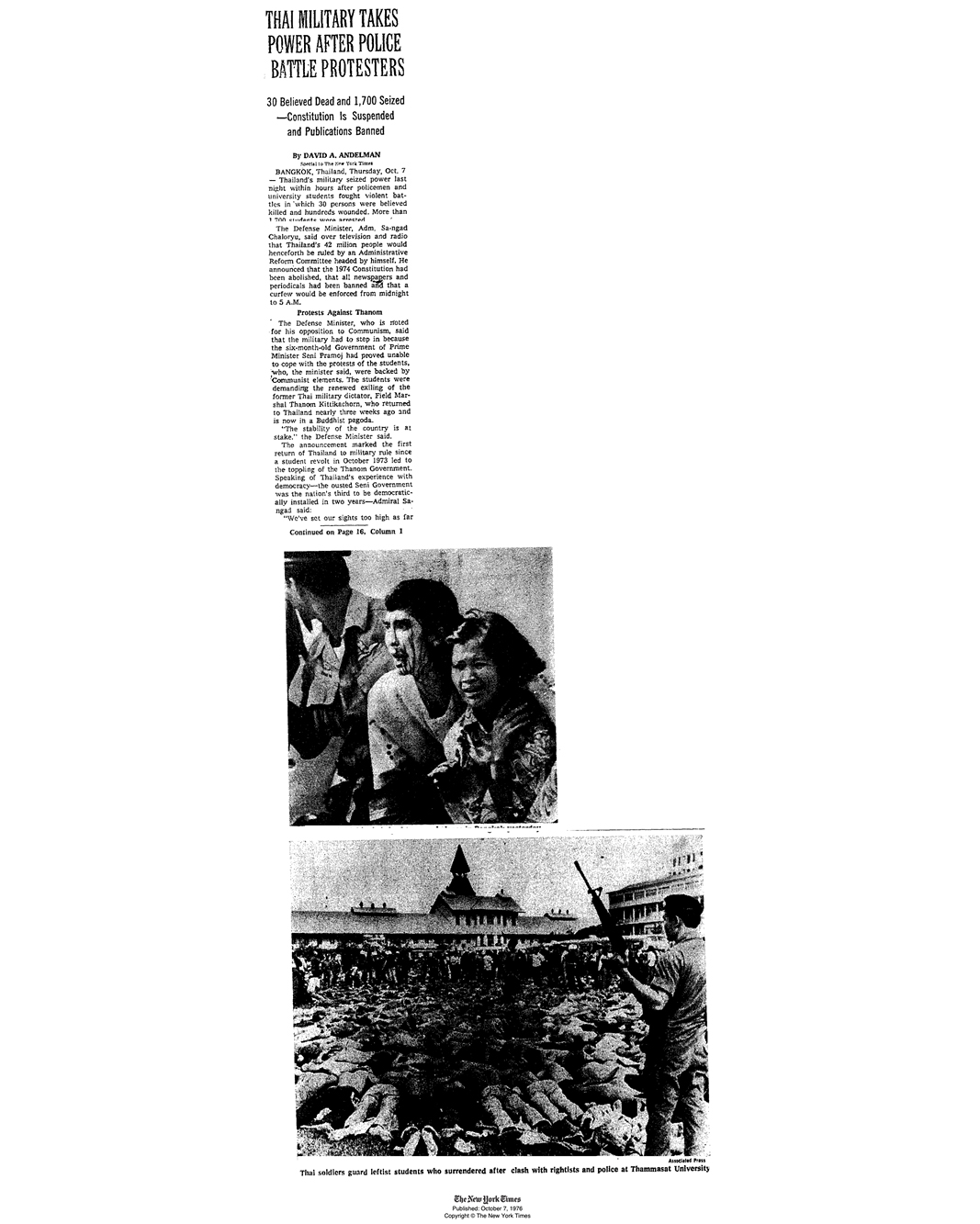 รายงานข่าวชุดนี้ได้รับการตีพิมพ์ลงในหนังสือพิมพ์ The New York Times ฉบับวันที่ 7 ตุลาคม 2519 โดยมีพาดหัวรองว่า “เชื่อว่ามีผู้เสียชีวิต 30 คนและถูกจับกุม 1,700 คน รัฐธรรมนูญถูกระงับ และสิ่งพิมพ์ถูกสั่งแบน” พร้อมระบุว่า “กองทัพได้เข้าควบคุมอำนาจการปกครองของประเทศไทยในคืนวันพุธ เพียงไม่กี่ชั่วโมงหลังจากที่ตำรวจและนักศึกษาฝ่ายขวาได้ปะทะกับกลุ่มนักศึกษาฝ่ายซ้ายในการต่อสู้ที่นองเลือดที่สุดครั้งหนึ่งในประวัติศาสตร์ของประเทศนี้ ซึ่งมีรายงานว่ามีผู้เสียชีวิตอย่างน้อย 30 คนและบาดเจ็บอีกหลายร้อยคน”
