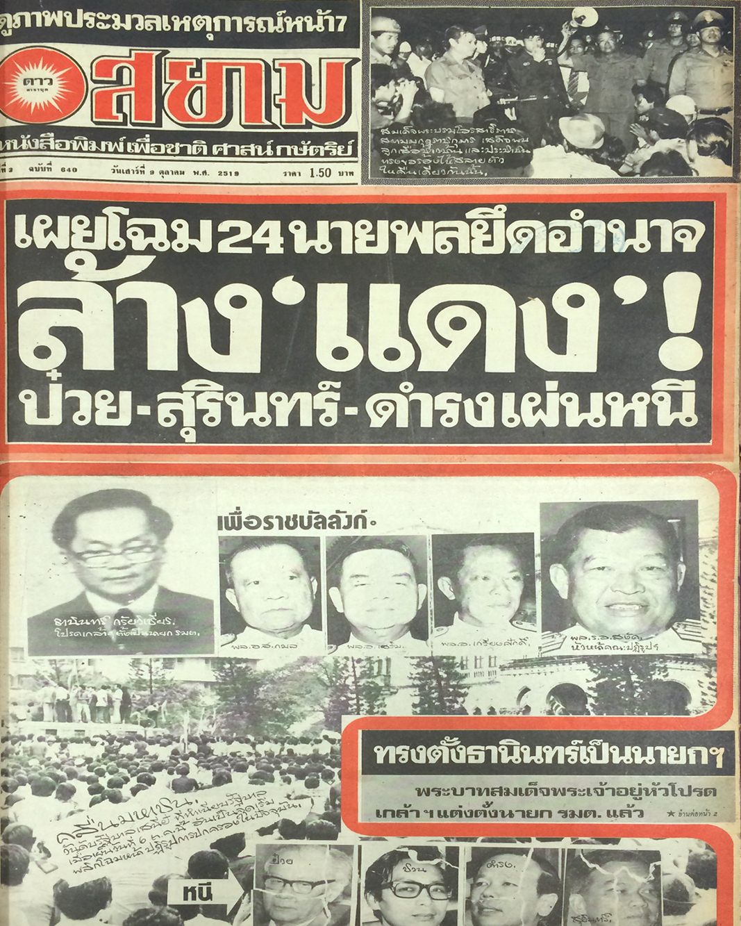 หนังสือพิมพ์ดาวสยาม ซึ่งเป็นหนังสือพิมพ์ ‘ฝ่ายขวา’ และมีสโลแกนว่า ‘เพื่อชาติ ศาสน์ กษัตริย์’ ฉบับวันที่ 9 ตุลาคม 2519 พาดหัวด้วยการเปิดหน้านายพลที่ยึดอำนาจเสมือนการสรรเสริญผู้ชนะสงคราม โดยใช้คำว่า ‘เพื่อราชบัลลังก์’ ขณะเดียวกันก็เปิดชื่อของผู้ที่หลบหนี ได้แก่ ป๋วย อึ๊งภากรณ์ อธิการบดีมหาวิทยาลัยธรรมศาสตร์, สุรินทร์ มาศดิตถ์ และดำรง ลัทธพิพัฒน์ สส. พรรคประชาธิปัตย์ที่ถูกกล่าวหาว่าเป็น ‘ฝ่ายซ้าย’ พร้อมทั้งเน้นหนักคำว่า ‘ล้างแดง’ ซึ่งอาจแปลความได้ถึงการปราบปราม ‘คอมมิวนิสต์’