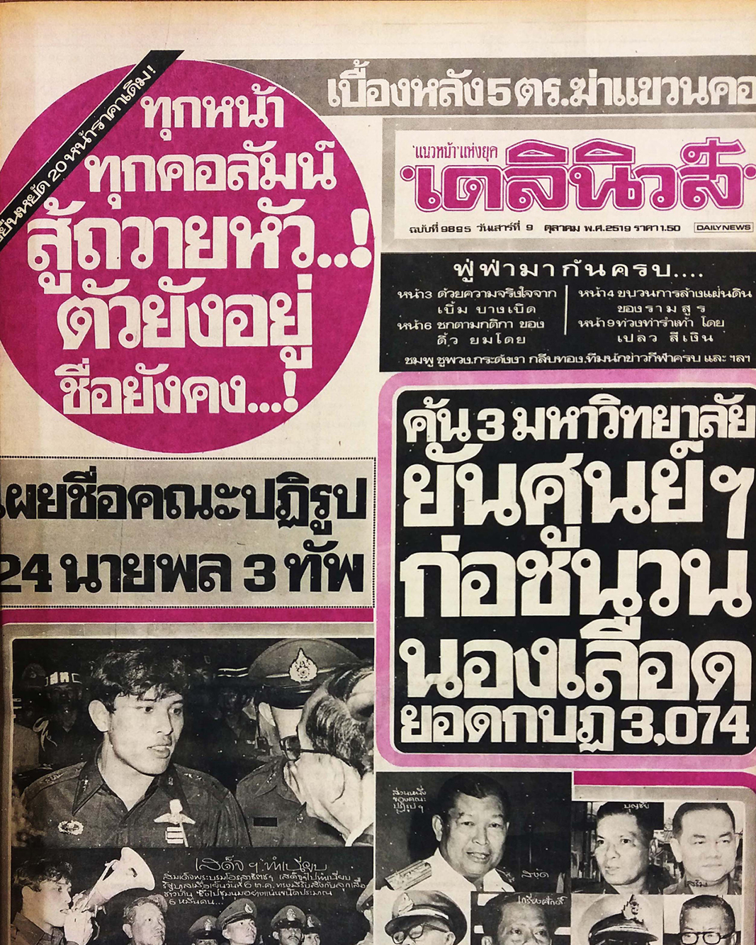 หนังสือพิมพ์เดลินิวส์ ฉบับวันที่ 9 ตุลาคม 2519 มีเนื้อหาที่คล้ายกับหนังสือพิมพ์ดาวสยามในส่วนของการ ‘เปิดหน้า’ คณะปฏิรูปการปกครอง แต่สิ่งที่น่าสนใจคือ มีการ ‘เปิดตัวละคร’ เพิ่มเติมได้แก่ อาจารย์ลาวัณย์ อุปอินทร์ มหาวิทยาลัยศิลปากร และไรน่าน อรุณรังษี อดีต สส.จังหวัดพัทลุง พรรคสังคมนิยมแห่งประเทศไทย ซึ่งก็คือผู้ที่ร่วมแต่งหน้าให้กับนักแสดงที่ตกเป็นประเด็นหมิ่นพระบรมเดชานุภาพ
