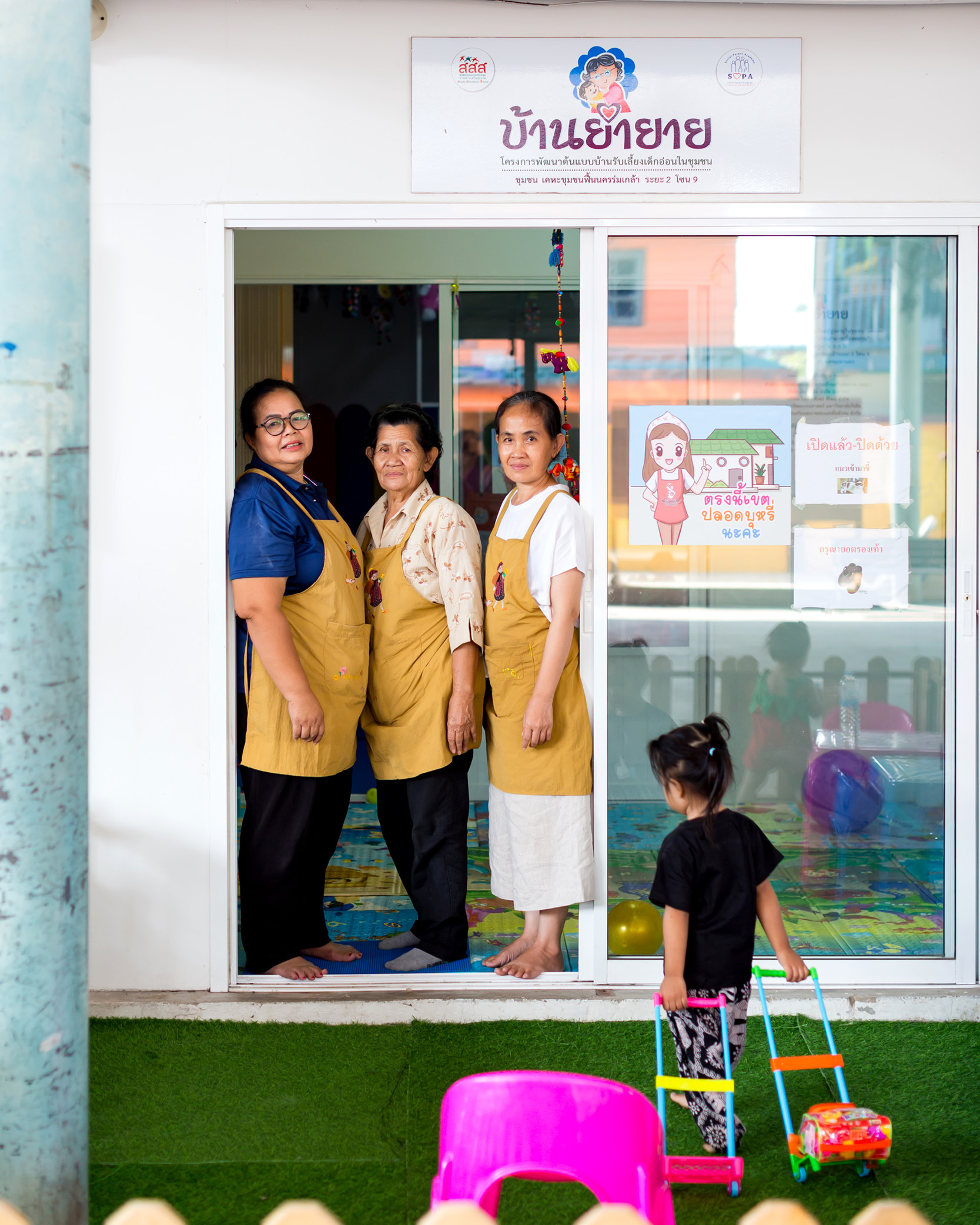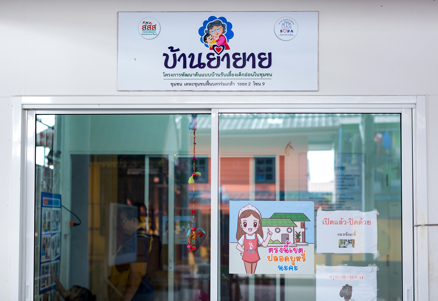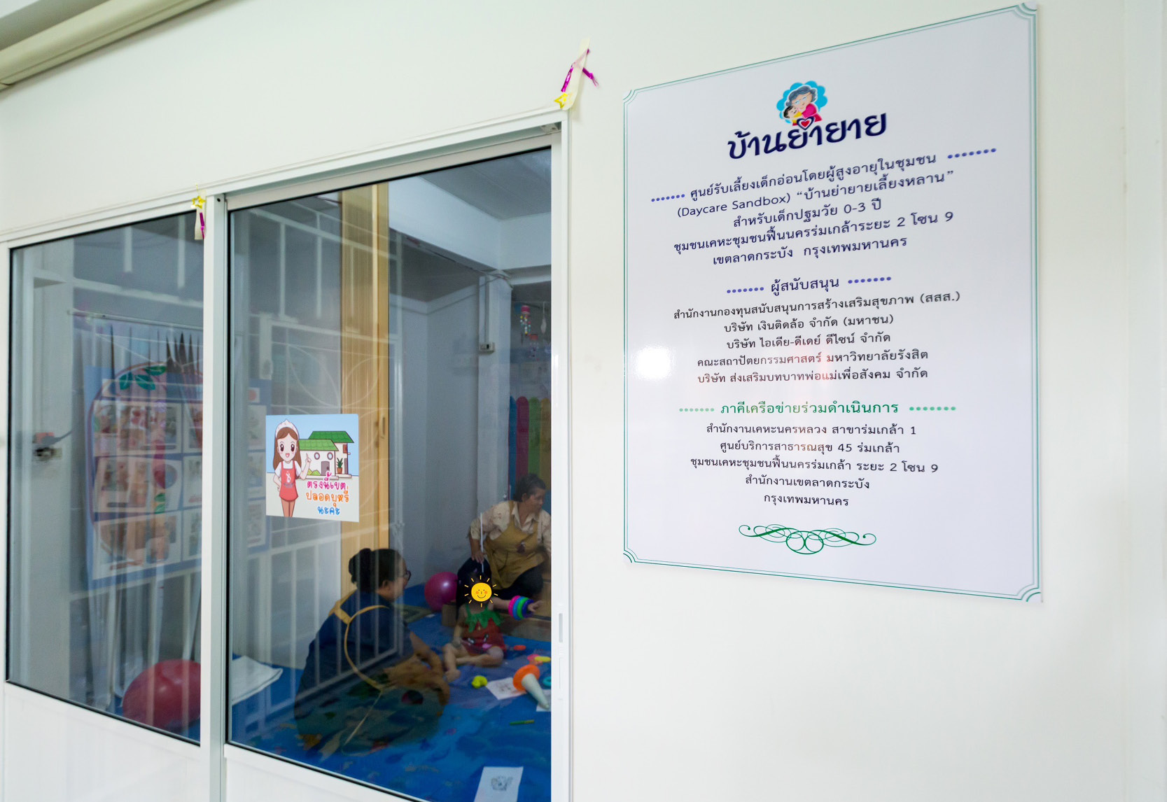 โครงการบ้านย่ายายจึงเข้ามาเติมเต็มช่องว่างระหว่างครอบครัวกับเด็กอ่อน โดยใช้กลไกอาสาสมัครสาธารณสุข (อสส.) ในการออกสำรวจเด็กอ่อนตามบ้านแต่ละหลัง เพื่อประเมินความจำเป็นในการพาเด็กเข้ามาอยู่ในความดูแลของโครงการ ขณะเดียวกันก็ร่วมงานกับสำนักงานกองทุนสนับสนุนการสร้างเสริมสุขภาพ (สสส.) เครือข่ายภาคประชาสังคมอย่าง SOPA ส่งเสริมบทบาทพ่อแม่เพื่อสังคม มหาวิทยาลัย รวมทั้งเอกชน ที่ร่วมกันออกทุนและออกแบบสถานที่ที่เหมาะสมสำหรับการดูแลเด็กอ่อน ภายใต้การสนับสนุนที่ดินจากการเคหะแห่งชาติ