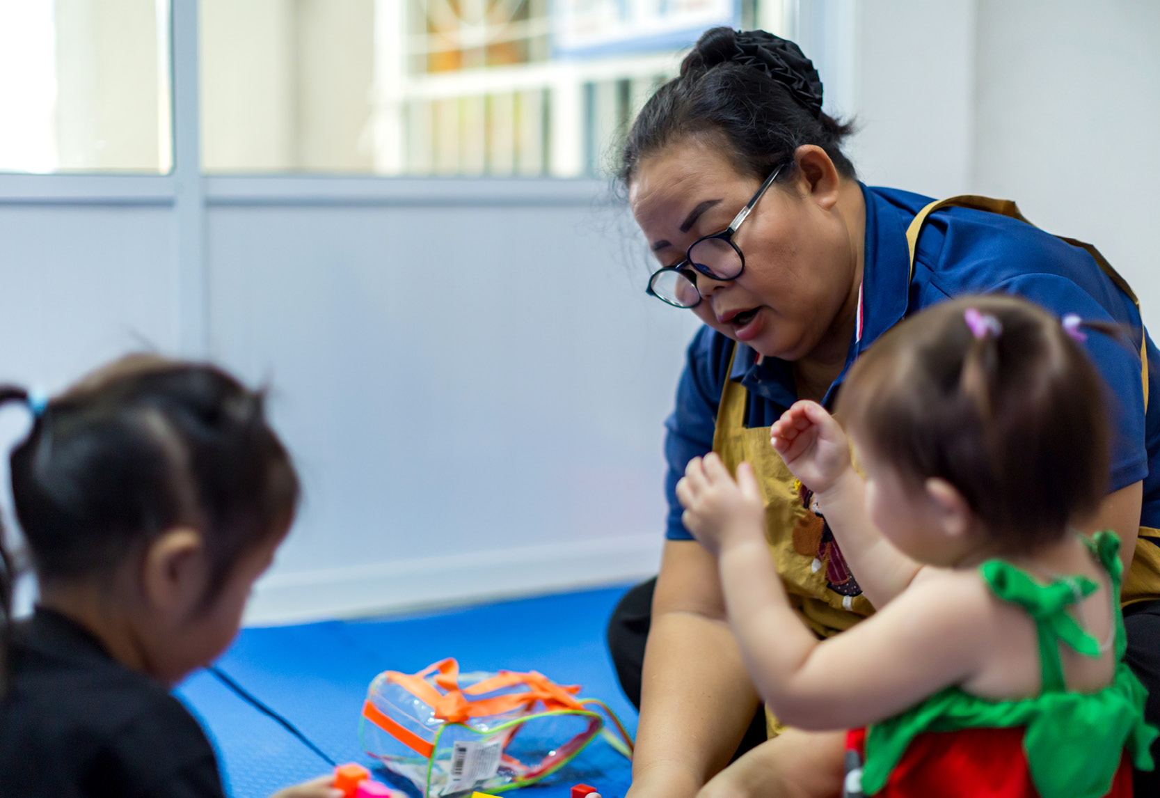 “บางคนขี้มูกไหล พ่อแม่เขาก็จะเอายาฝากมากับเด็กด้วย เราก็จะป้อนยาให้กับเขา กิจวัตรประจำวันตอนเช้าพ่อแม่มาส่ง กินข้าวเช้าเสร็จ ก็พาทำกิจกรรม ระบายสี เล่นเลโก้ บางคนก็ให้เราเล่านิทานให้ฟัง สักประมาณ 11 โมง ก็กินข้าวกลางวัน พอช่วงบ่ายก็ให้กินขนม นม ผลไม้ เขาก็จะเล่นกันอีกสักพัก ประมาณบ่าย 3-4 โมง พ่อแม่เด็กก็จะมารับกลับบ้าน” อ้อยกล่าว