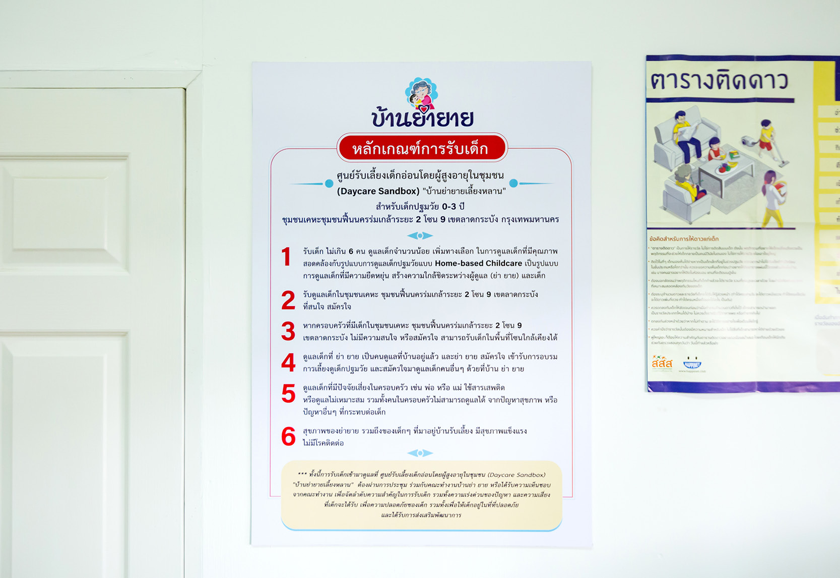 ทั้งนี้โครงการบ้านย่ายายยังคงจำกัดการรับเด็กที่ 6 คน เพื่อไม่ให้เกินระเบียบของรัฐเกี่ยวกับสถานดูแลเด็ก ซึ่งมีบางส่วนไม่สอดคล้องกับความเป็น ‘บ้าน’ เช่น มาตรฐานความปลอดภัย ทางเข้า-ทางออก และบันไดหนีไฟ ขณะนี้ได้มีการร่างข้อบัญญัติใหม่เรื่องศูนย์เด็กเล็ก หากผ่านการพิจารณาและบังคับใช้ ก็จะสามารถขยายการดูแลเด็กอ่อนได้เพิ่มขึ้น