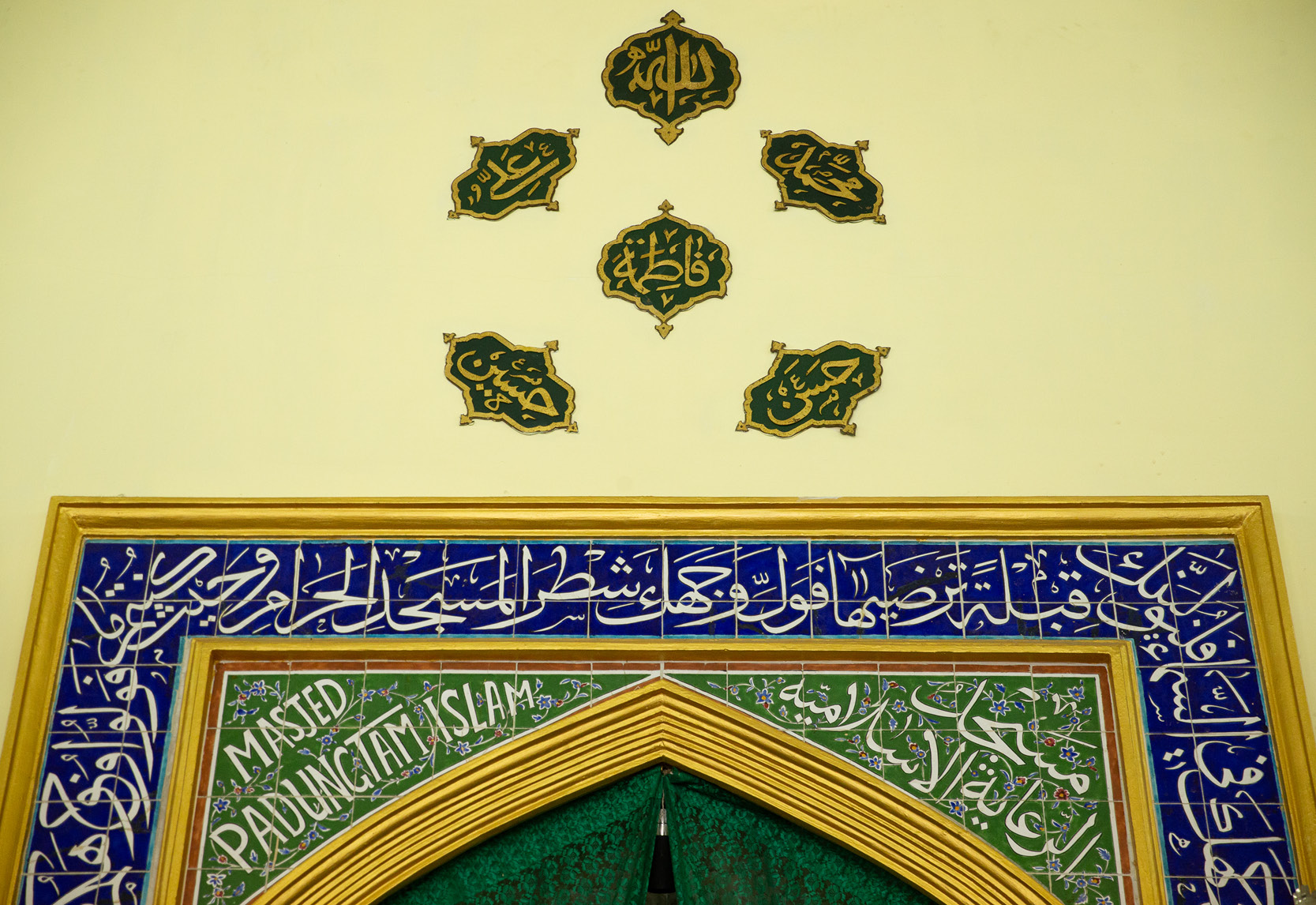 “จุดที่แตกต่างชัดที่ชัดเจนเลยคือ มัสยิดสำนักคิดชีอะฮ์จะมี ‘ปันญะตันป๊าก’ (Panjtan Pak) หรือพระนามของ 5 ผู้บริสุทธิ์ ได้แก่ มุฮัมมัด อะลี ฟาฏิมะฮ์ ฮะซัน และฮูเซน เป็นภาษาอาหรับประดับอยู่เหนือซุ้มเมี๊ยะหร็อบ” อาจารย์เอมสรุปให้ฟัง