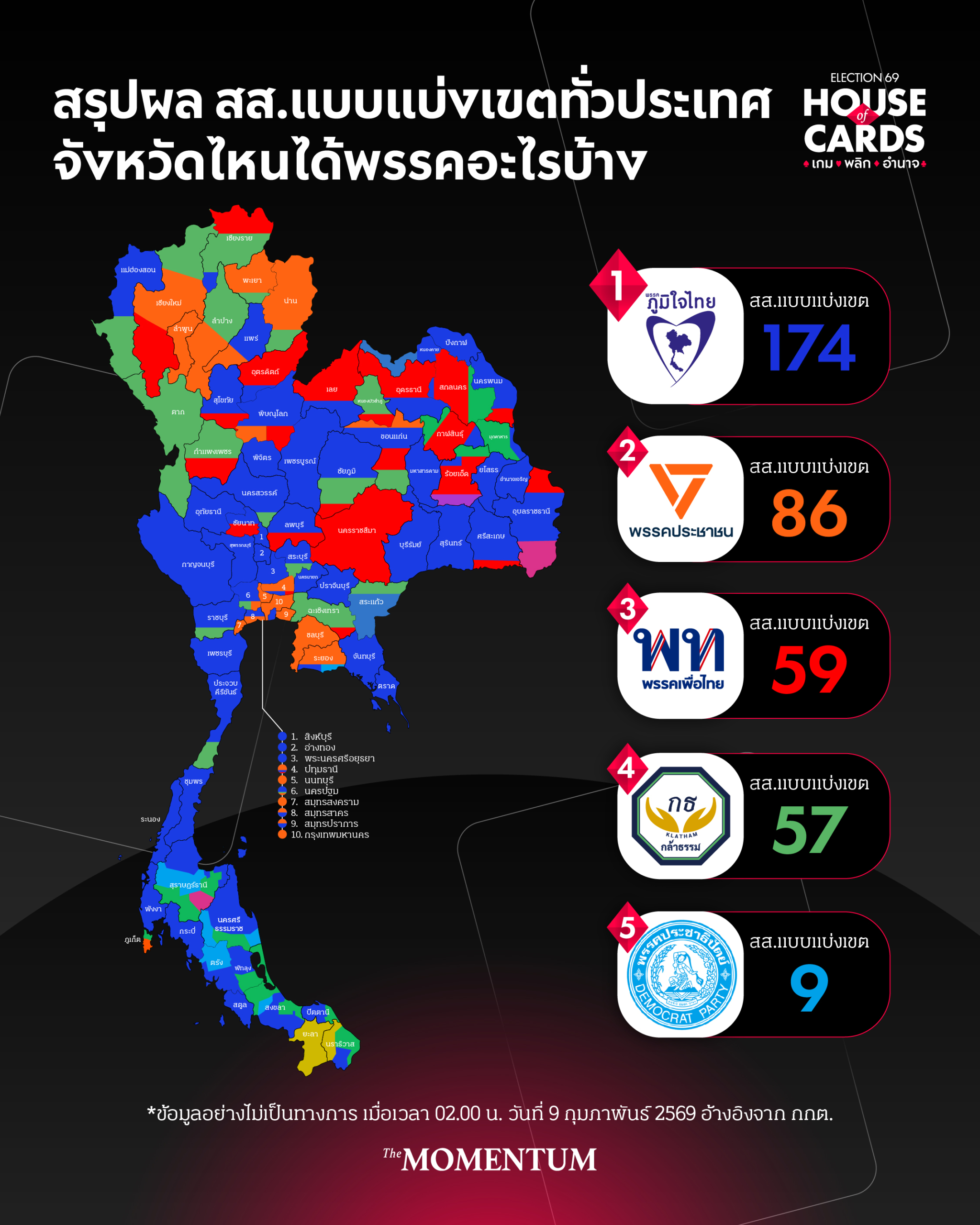ส่วนอันดับต่อมาได้แก่พรรคประชาชน 86 คน พรรคเพื่อไทย 59 คน พรรคกล้าธรรม 57 คน และพรรคประชาธิปัตย์ 9 คน