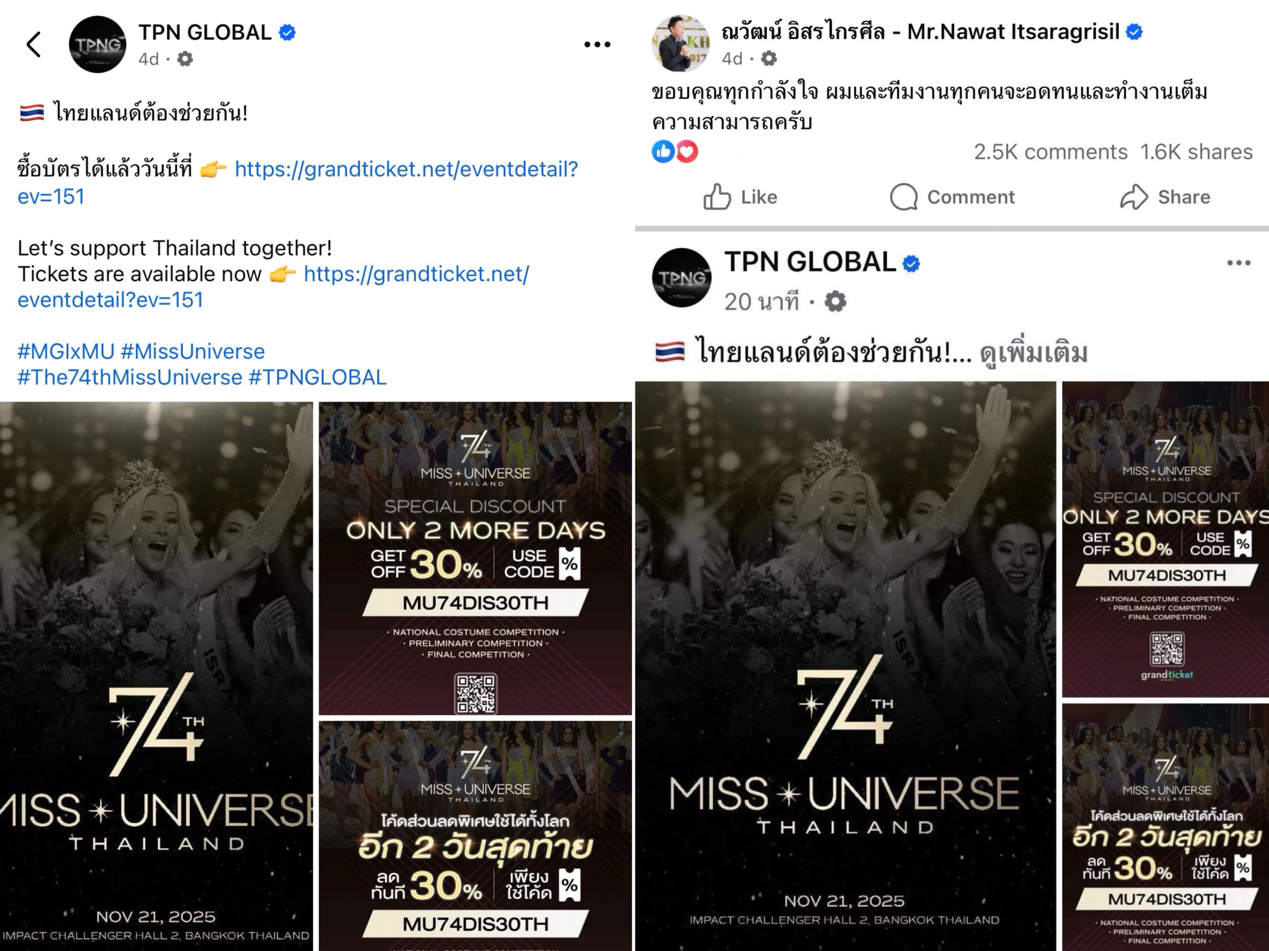 เป็นที่รู้กันของ ‘เหล่าแฟนนางงาม’ ว่า TPN Global ผู้ถือลิขสิทธิ์คนก่อน และ MGI ผู้ถือลิขสิทธิ์คนปัจจุบันมีข้อพิพาทกันมาโดยตลอด ซึ่งน่าจะเริ่มต้นในปี 2021 อย่างไรก็ตาม เมื่อวันที่ 13 พฤศจิกายนที่ผ่านมา ก็ถือได้ว่ามีน้ำทิพย์มาชโลมใจให้เหล่าแฟนนางงาม จากการช่วยประชาสัมพันธ์การขายบัตรรอบวันตัดสิน ของการประกวดมิสยูนิเวิร์สครั้งที่ 74 โดยภายหลัง ‘บอสณวัฒน์’ ณวัฒน์ อิสรไกรศีล ประธานเจ้าหน้าที่บริหาร MGI ก็แสดงความขอบคุณ ซึ่งเปรียบเสมือนสัญญาณอันดี ให้เหล่าแฟนนางงามกลับมาสามัคคีกันก่อนการประกวดที่ใกล้เข้ามา