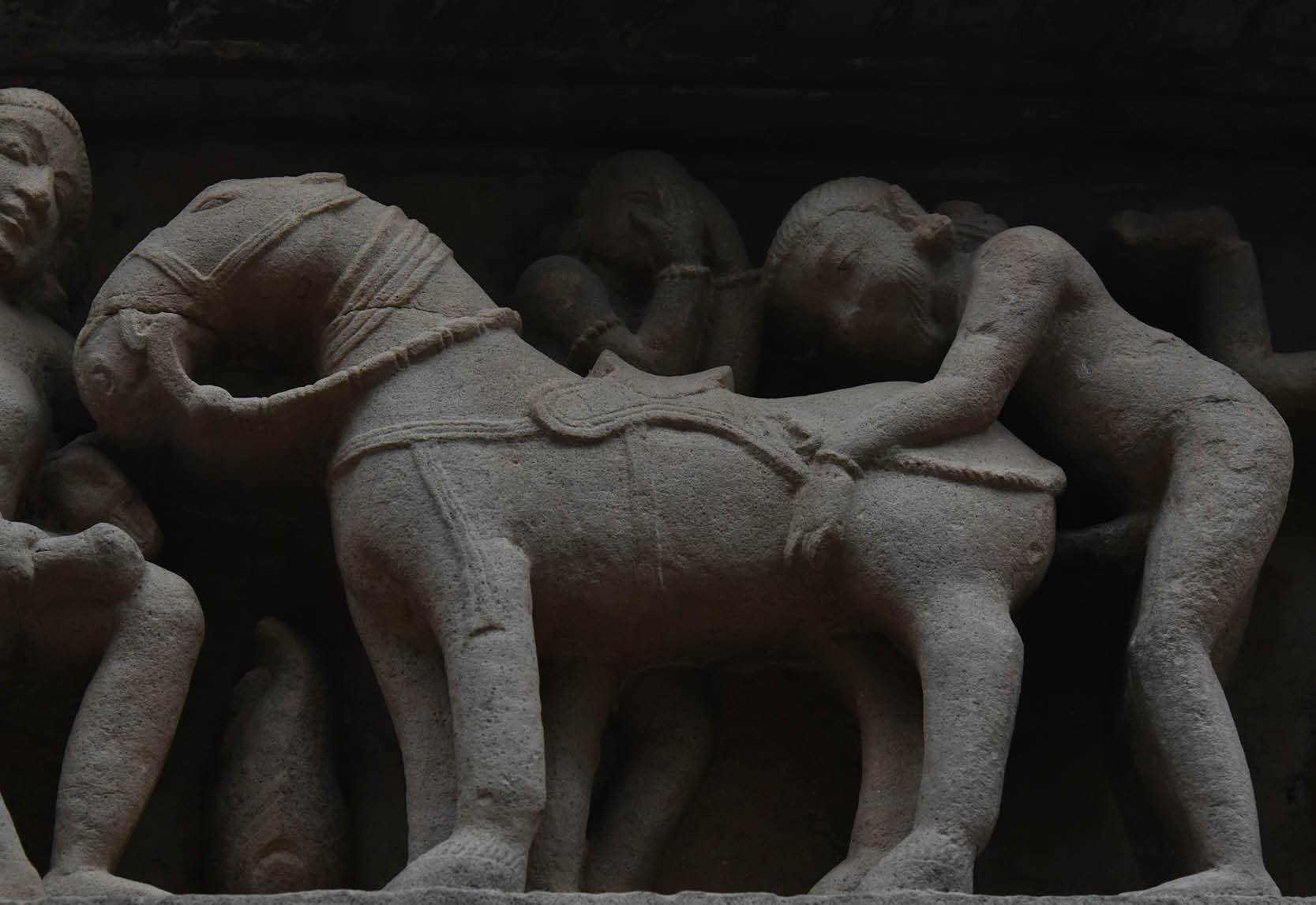 การศึกษาโครงสร้างทางประติมานวิทยาของเทวาลัยแห่งนี้ ถูกบรรยายไว้แล้วอย่างพิสดารโดยนักประวัติศาสตร์ศิลปะชาวอินเดีย เทวังคนะ เดไส (Devangana Desai) ตีพิมพ์ออกมาเป็นหนังสือคลาสสิกเล่มมหึมา The Religious Imagery of Khajuraho ซึ่งแน่นอนว่าสิ่งนั้นยังไม่ใช่จุดสนใจของข้อเขียนนี้ เพราะสิ่งที่เราสนใจคือ ‘ภาพคนกับม้า!’ ภาพสลักสุดประทับใจบริเวณฐานรองรับเทวาลัย