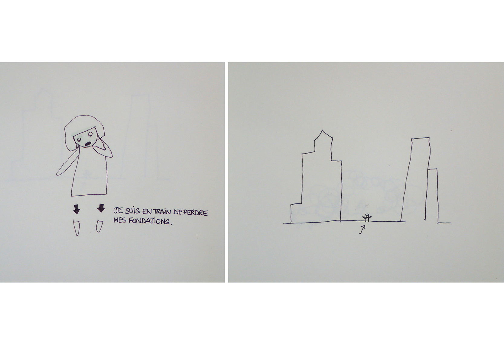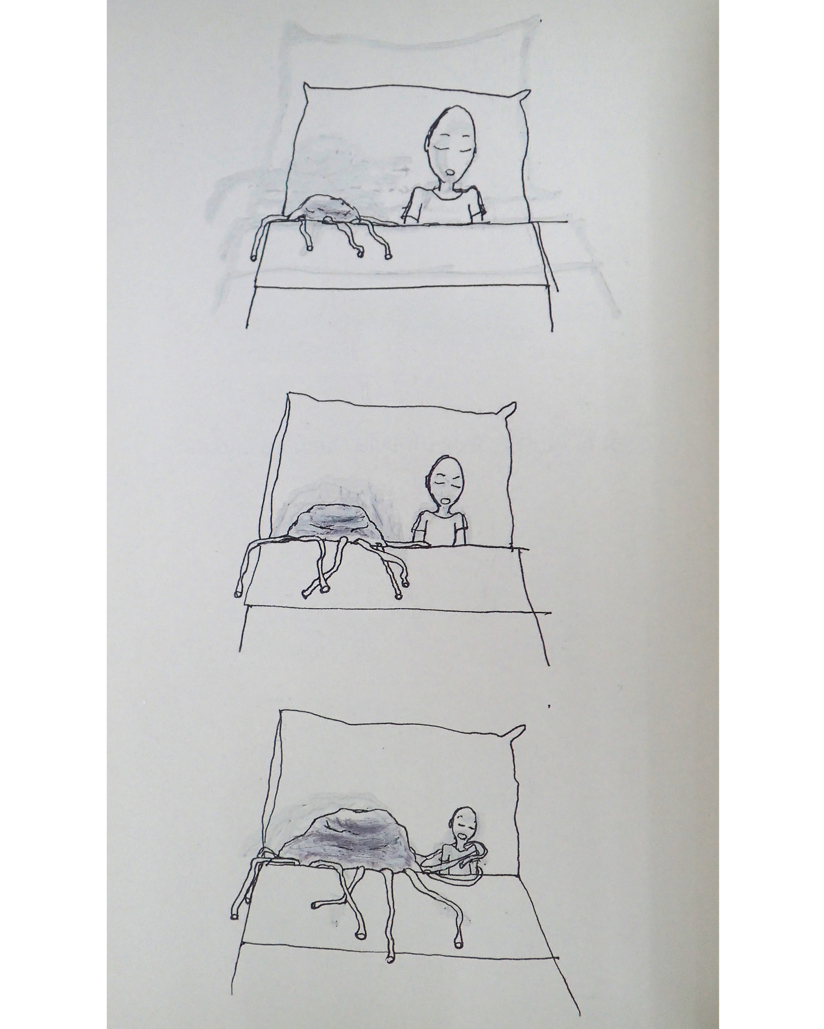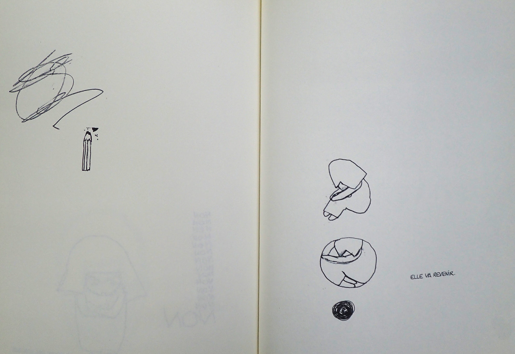 ทำไงดีนะ จะต่อสู้กับความรู้สึกหดหู่เศร้าโศกที่เลี่ยงไม่ได้นั้นได้อย่างไร ภาพคู่ต่อมา หน้าซ้ายเป็นภาพดินสอปลายหักพร้อมเส้นวงๆ ขีดเขียนไม่เป็นรูปเป็นร่าง ภาพขวาคือเด็กหญิงเริ่มขดตัวหาตัวเอง กลายเป็นขดกลม และวงกลมดำแบบเดียวกับที่เรียกมะเร็งว่า “ก้อนกลมๆ”