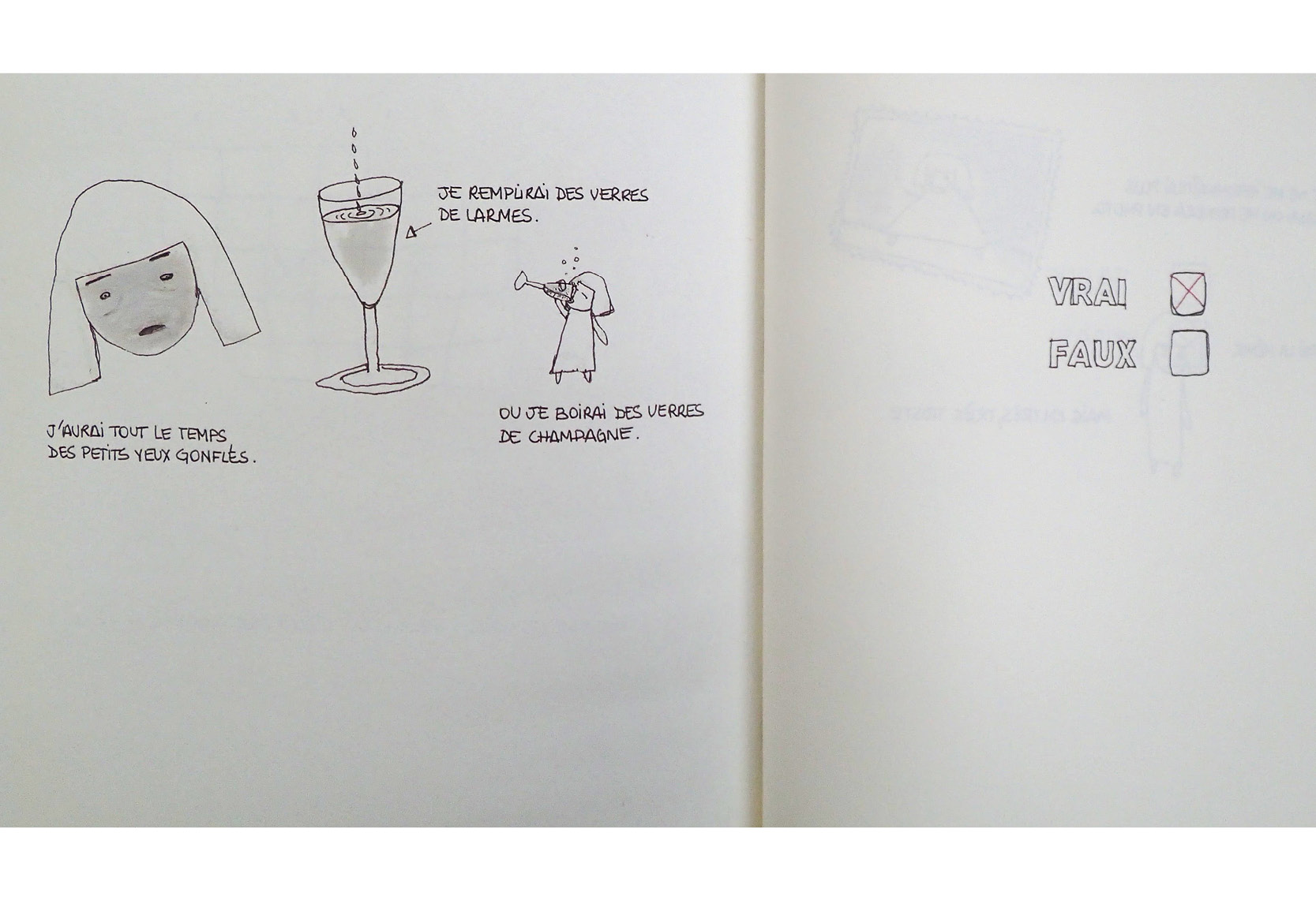 แล้วก่อนแม่จะเสีย เคยจินตนาการว่าตนจะเป็นเช่นไรหากแม่จากไป ผู้เล่าวาดออกมาเป็นเกมให้กาเลือกว่าจริงหรือเท็จถึง 7 หน้าคู่ หรือ 14 หน้า เช่น “ฉันจะตาบวมเป่งตลอดเวลา จะร้องไห้น้ำตาเต็มแก้ว หรือจะดื่มแชมเปญมากๆ” = จริง ☑ “ฉันจะเล่นกีฬา เล่นกีฬาเยอะๆ” = เท็จ 🗵 “ฉันจะตั้งคำถามอะไรต่ออะไรตลอดเวลาที่ใช้การอะไรไม่ได้ ยกเว้นบางคราว” =จริง ☑
