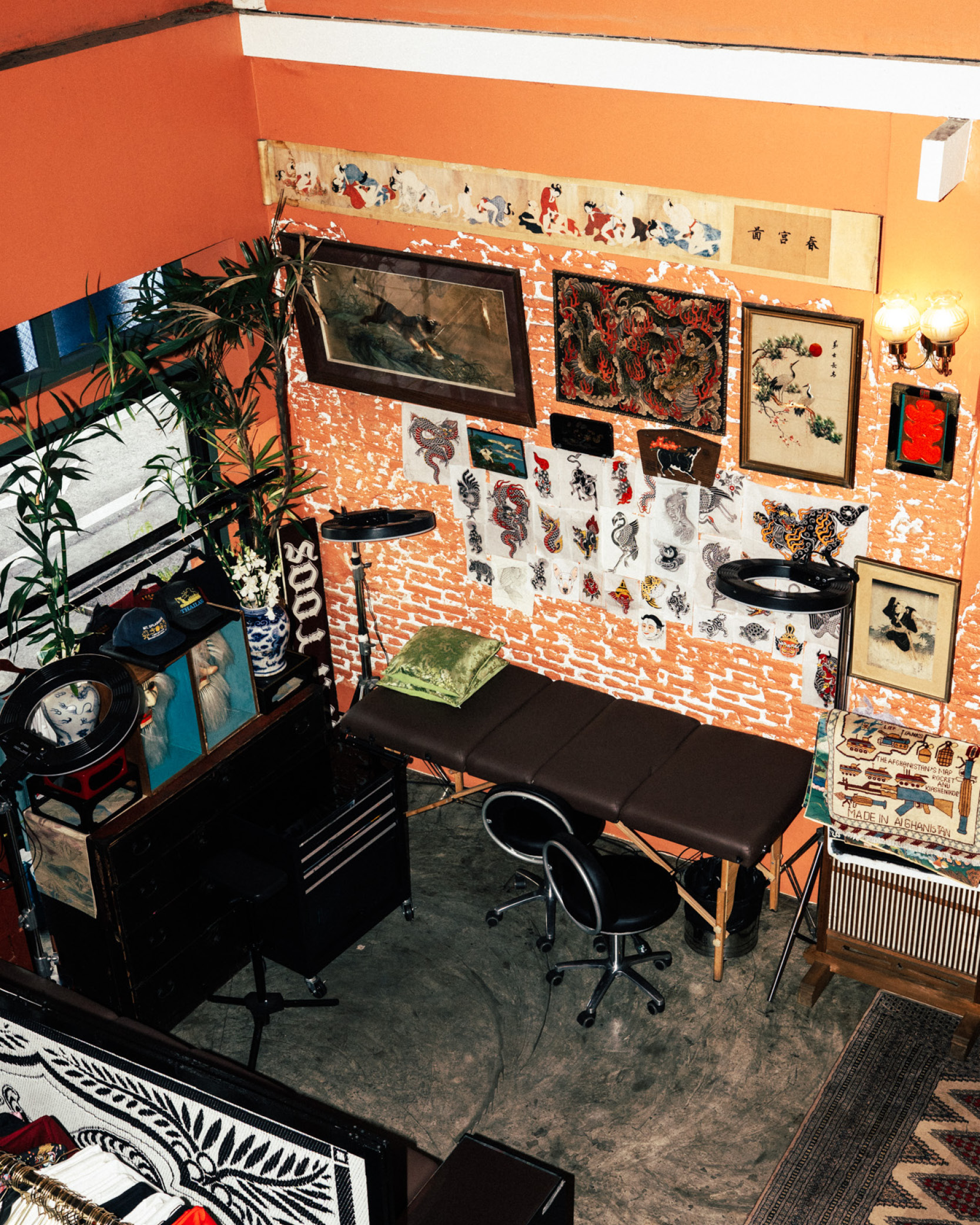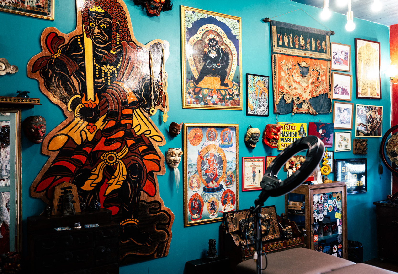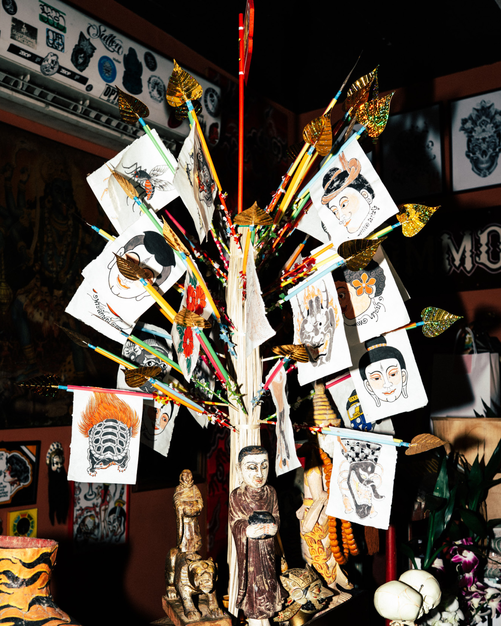 ในบรรดาตึกริมถนนเจริญกรุง ฝั่งศาลอาญากรุงเทพใต้ มีคูหาหนึ่งตรงข้ามโรงแรมโฟร์ซีซั่นส์ที่สะดุดตาเป็นพิเศษ กระจกร้านโชว์ให้เห็นรูปปั้นเจ้าแม่กวนอิม ประตูไม้สีเขียวเต็มไปด้วยสติกเกอร์เทพฮินดู เช่น พระพรหม พระศิวะ พระวิษณุ พระแม่กาลี ชวนให้สงสัยว่าที่แห่งนี้คือสถานปฏิบัติธรรม ร้านเสื้อผ้า หรือว่าอะไร ก่อนจะสอดส่องมองหาป้ายจนพบว่าเป็นร้านสักลาย จากป้ายไม้บนสุดระบุว่า TATTOOS ขนาบข้างด้วยโคมลายเสือเขียนอักษรจีนสีแดงเหมือนลวดลายในศาลเจ้า