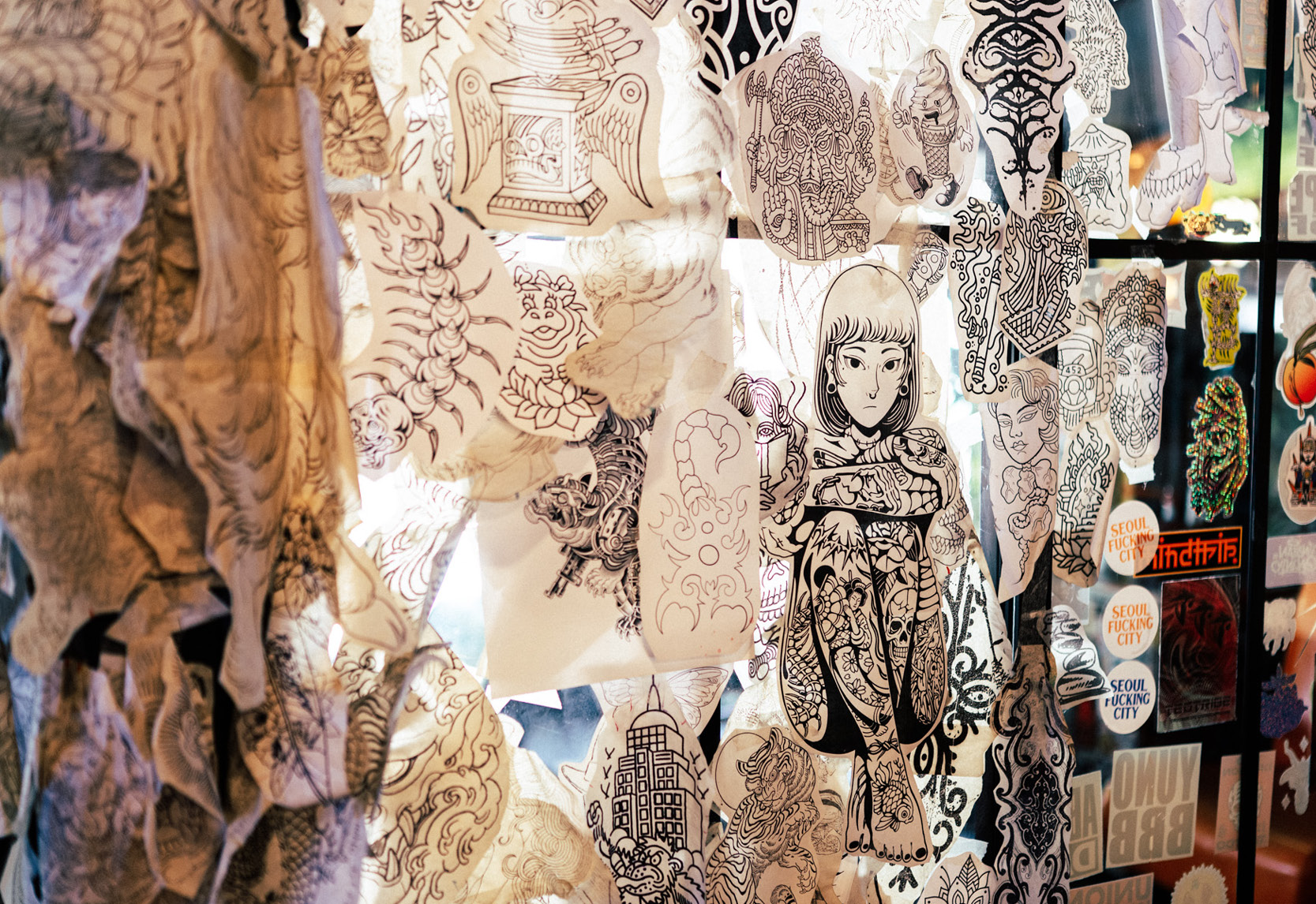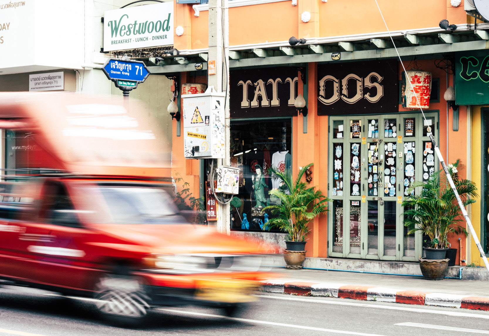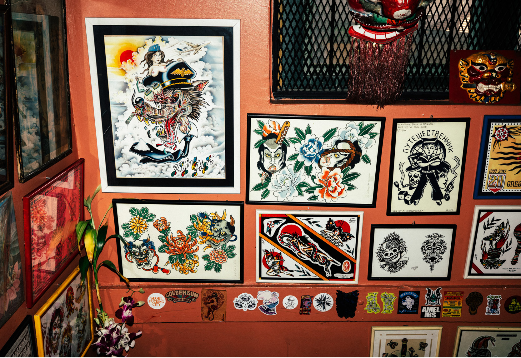 ในบรรดาตึกริมถนนเจริญกรุง ฝั่งศาลอาญากรุงเทพใต้ มีคูหาหนึ่งตรงข้ามโรงแรมโฟร์ซีซั่นส์ที่สะดุดตาเป็นพิเศษ กระจกร้านโชว์ให้เห็นรูปปั้นเจ้าแม่กวนอิม ประตูไม้สีเขียวเต็มไปด้วยสติกเกอร์เทพฮินดู เช่น พระพรหม พระศิวะ พระวิษณุ พระแม่กาลี ชวนให้สงสัยว่าที่แห่งนี้คือสถานปฏิบัติธรรม ร้านเสื้อผ้า หรือว่าอะไร ก่อนจะสอดส่องมองหาป้ายจนพบว่าเป็นร้านสักลาย จากป้ายไม้บนสุดระบุว่า TATTOOS ขนาบข้างด้วยโคมลายเสือเขียนอักษรจีนสีแดงเหมือนลวดลายในศาลเจ้า