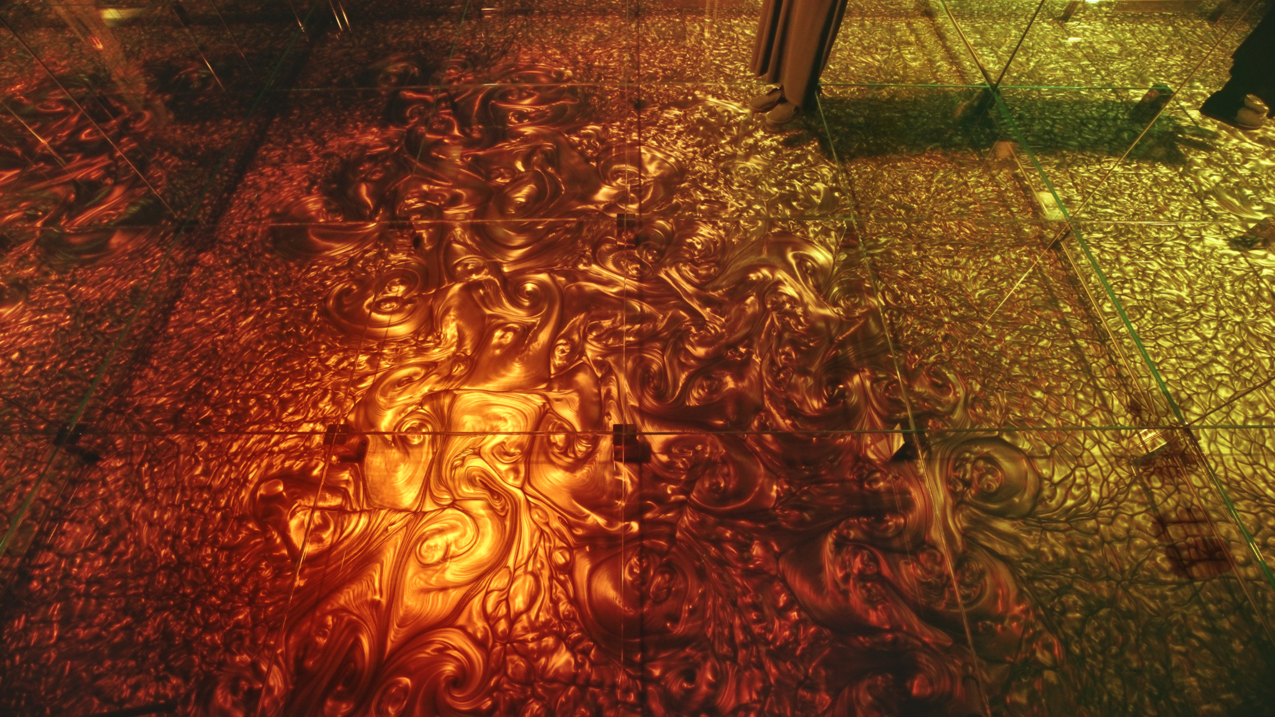 ลวดลายของของเหลวน้ำที่เห็นอยู่คือบ่อสี ที่เปลี่ยนรูปแบบเมื่อมนุษย์ลงไปเหยียบย่ำ ทำให้เห็นลวดลายของน้ำที่เคลื่อนไหวในทุกฝีก้าว ผลงานนี้เราสามารถมีส่วนร่วมในการลงไปเดินบนของเหลว แต่ต้องระมัดระวังว่าสีจะเลอะกับเสื้อผ้า สำหรับคนที่อยากลองเล่นต้องเตรียมตัวให้พร้อมสักเล็กน้อย และเรามีรองเท้าบูตให้ยืมสำหรับโซนนี้