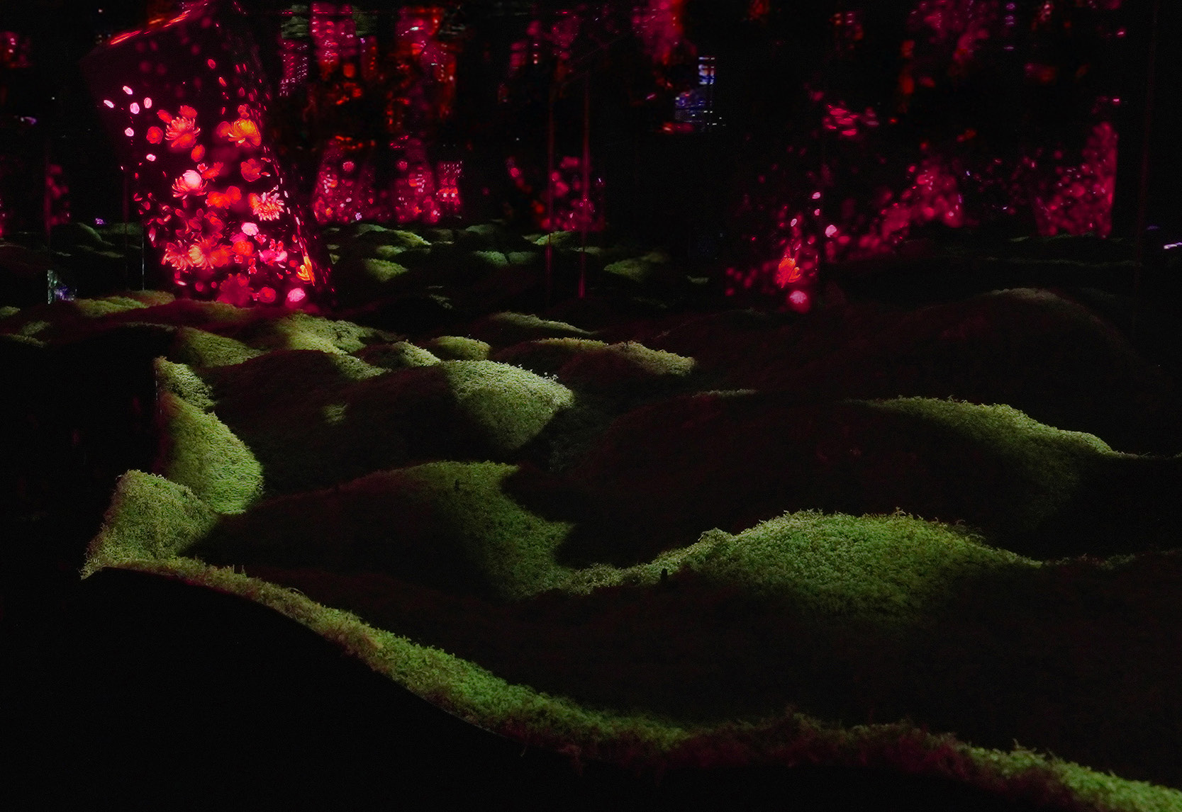 ผลงานศิลปะขนาดใหญ่ที่กินพื้นที่เกือบทั้งชั้น ในพื้นที่แห่งนี้เปิดโอกาสให้เราได้เข้าใกล้กับคำว่า ระบบนิเวศ อย่างแท้จริง เมื่อเดินเข้าไปสำรวจใกล้ๆ จมูกปะทะกับกลิ่นเขียวๆ ของต้นไม้ เพราะต้นไม้เล็กๆ กับมอสส์สีเขียวที่เห็นในภาพเป็นพืชที่ปลูกไว้จริง และในบางครั้งก็มีฝนตกลงมา (เป็นฝนเทียมของ teamLab Biovortex Kyoto) เพื่อรดน้ำให้ต้นไม้ได้เจริญเติบโต Eternal Existence in the Sun and Rain จึงเป็นผลงานศิลปะกับธรรมชาติที่ผสมผสานกันได้อย่างน่าสนใจ