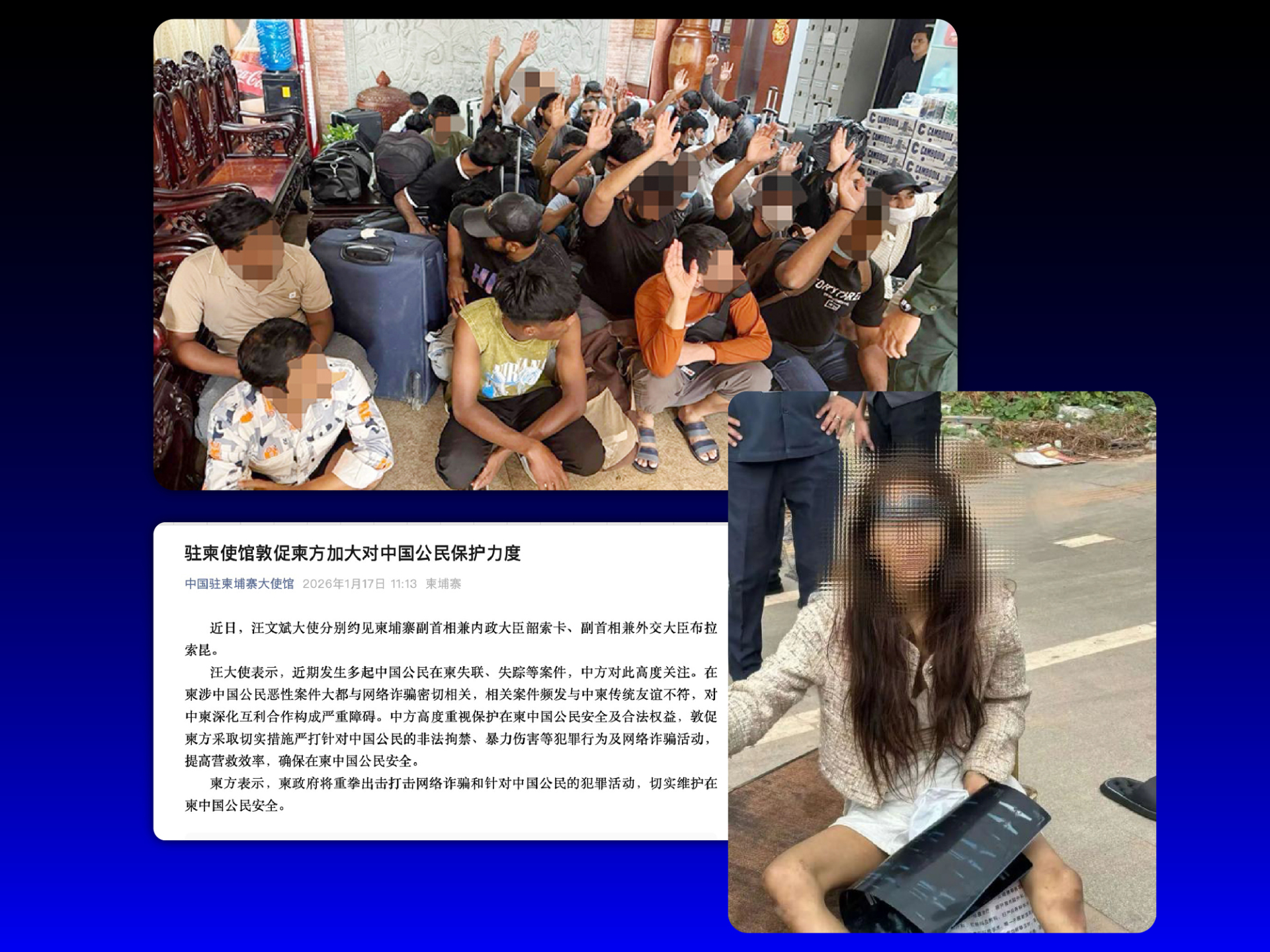 เมื่อวันที่ 17 มกราคม 2026 สถานทูตจีนในกัมพูชาเรียกร้องให้รัฐบาลกัมพูชาเพิ่มมาตรการคุ้มครองพลเมืองจีนในประเทศ เนื่องจากชาวจีนจำนวนหลายคนยังคงหายสาบสูญหลังเดินทางเข้ากัมพูชา