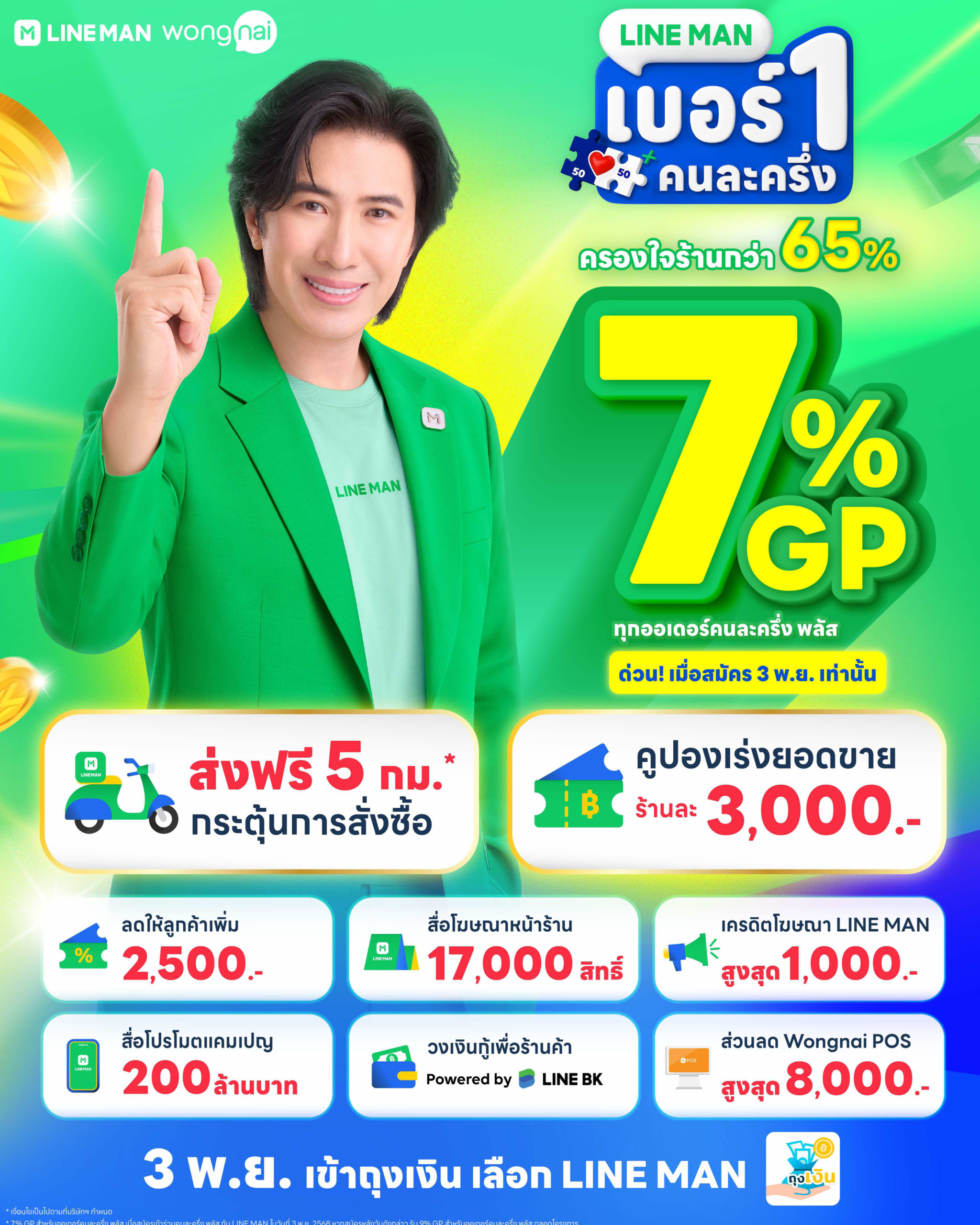 ในช่วงปลายปีที่ภาคธุรกิจร้านอาหารกำลังจับตาความเคลื่อนไหวของโครงการ ‘คนละครึ่งพลัส’ ที่เตรียมกลับมากระตุ้นกำลังซื้อของผู้บริโภคทั่วประเทศ LINE MAN แพลตฟอร์มฟู้ดเดลิเวอรีอันดับหนึ่งของไทย ก็เป็นอีกหนึ่งผู้เล่นที่ขยับเกมก่อนใคร ด้วยการประกาศปรับลดค่า GP เหลือเพียง 7% สำหรับร้านอาหารที่สมัครเข้าร่วมโครงการในวันที่ 3 พฤศจิกายน 2568 และลดเหลือ 9% สำหรับร้านที่สมัครตั้งแต่วันที่ 4 พฤศจิกายนเป็นต้นไปจนจบโครงการ