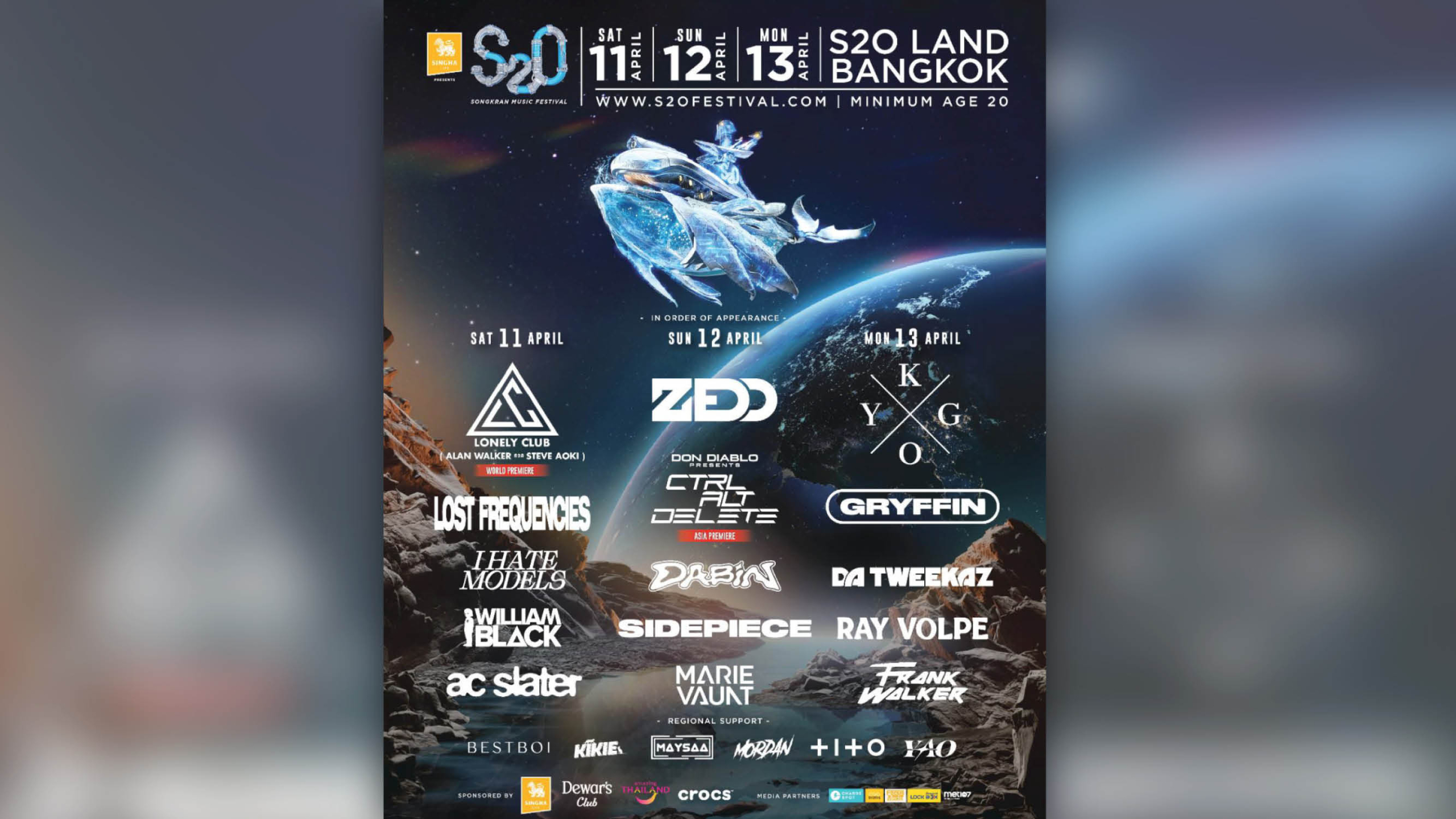 11 เมษายน เปิดฉากด้วย World Premiere ครั้งแรกของโลกกับโปรเจกต์ Lonely Club การโคจรมาเจอกันแบบ B2B ของ Alan Walker และ Steve Aoki เสริมทัพด้วย Lost Frequencies และ I Hate Models