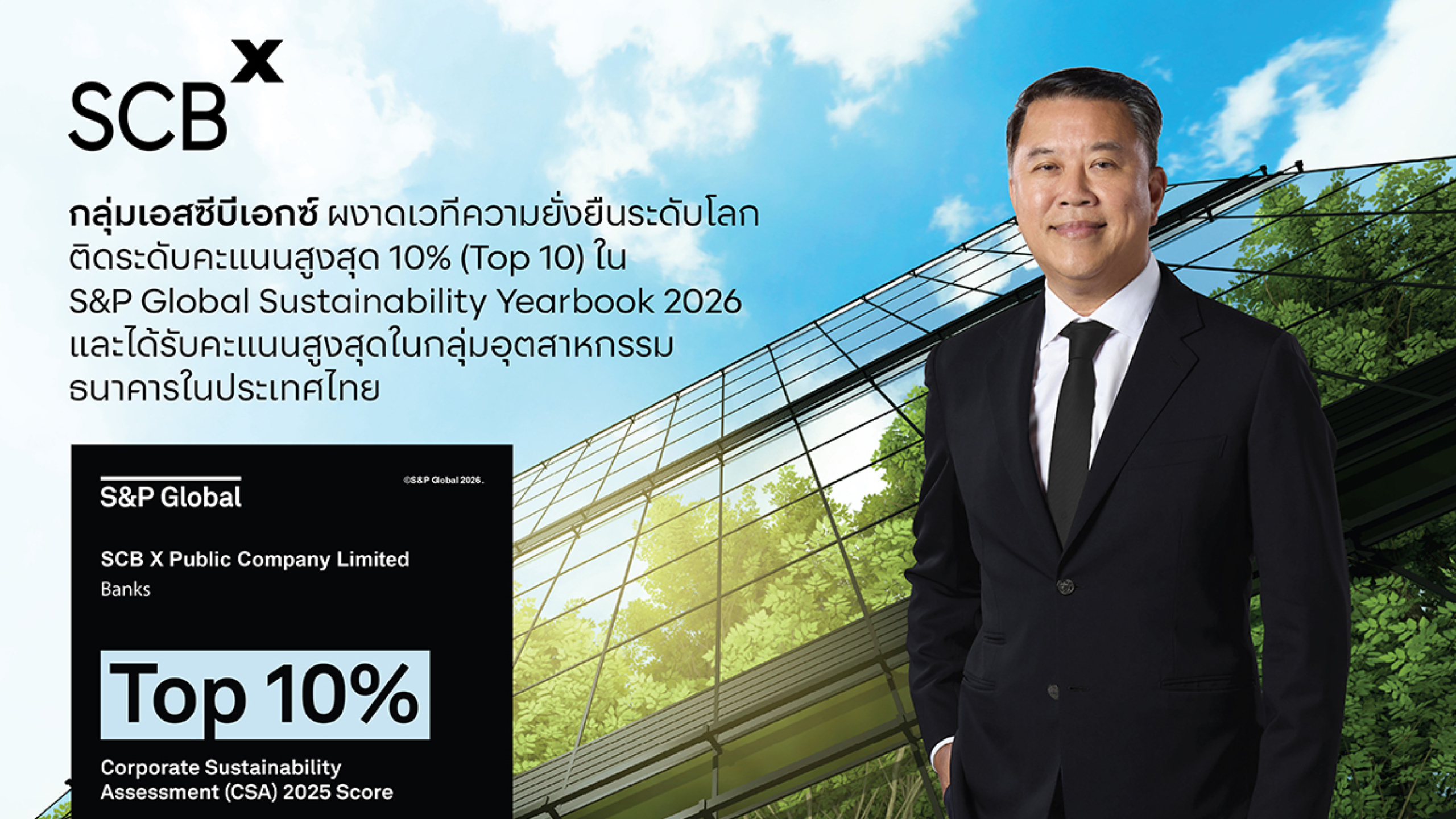 อาทิตย์ นันทวิทยา ประธานเจ้าหน้าที่บริหาร บริษัท เอสซีบี เอกซ์ จำกัด (มหาชน) หรือ SCBX กล่าวว่า “เราเชื่อว่านวัตกรรมเทคโนโลยีและการเงินต้องเดินเคียงคู่ไปกับความรับผิดชอบ การที่กลุ่มเอสซีบีเอกซ์ ได้รับการจัดอันดับใน S&P Global Sustainability Yearbook 2026 รวมถึงคะแนนที่เพิ่มสูงขึ้นติดอันดับโลก เป็นเครื่องพิสูจน์ถึงความมุ่งมั่นขององค์กรในการบูรณาการประเด็นด้านความยั่งยืนเข้าไปในการดำเนินธุรกิจ โดยเดินหน้าสนับสนุนการเปลี่ยนผ่านสู่เศรษฐกิจคาร์บอนต่ำ (Low-carbon Economy) และลดความเหลื่อมล้ำในการเข้าถึงบริการทางการเงินผ่านนวัตกรรมดิจิทัล เพื่อสร้างคุณค่าที่แท้จริงให้แก่สังคมและโลกในระยะยาว”