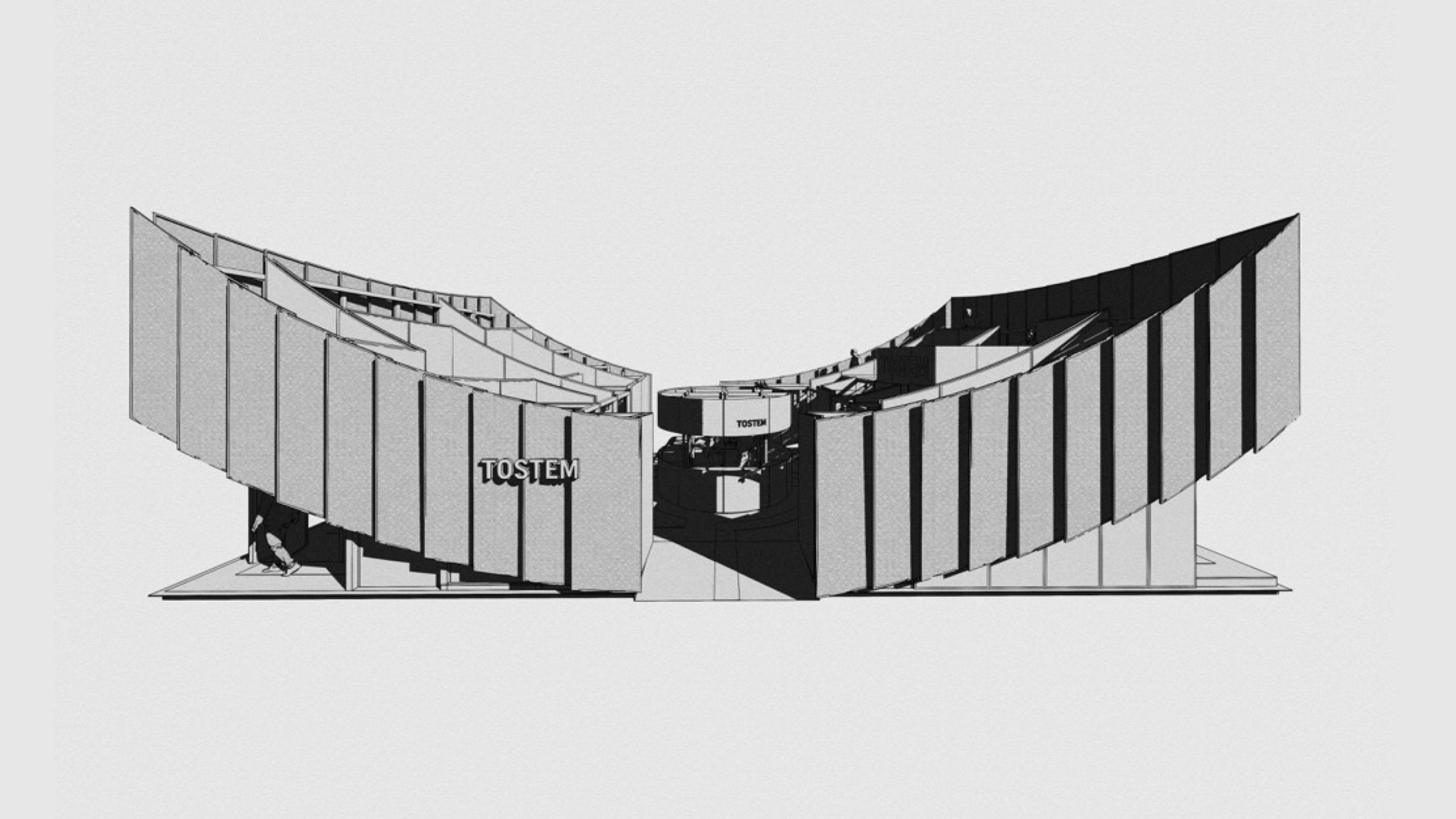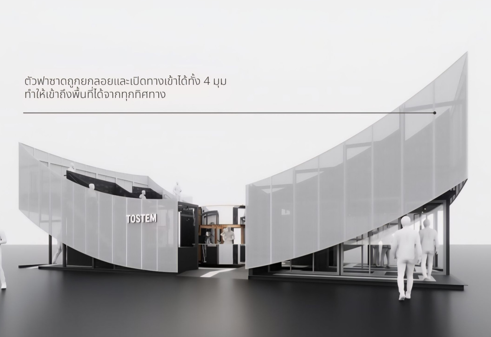นอกจากไปเดินชมนวัตกรรมใหม่แล้ว การแวะไปที่บูทของ TOSTEM จะได้พบกับสุนทรียภาพของการจัดสรรสเปซ ซึ่งออกแบบโดย ภากร มหพันธ์ สถาปนิกจากบริษัท เอ็มสเปซ จำกัด (M SPACE) ที่หยิบยกความอ่อนช้อยทว่าแข็งแกร่งของเกราะซามูไรญี่ปุ่น มาตีความใหม่เป็นเส้นสายโค้งมนในการตกแต่งฟาซาด หรือองค์ประกอบด้านหน้า โดยตัวโครงสร้างถูกออกแบบให้ลอยเด่นและเปิดกว้างทั้ง 4 ทิศทาง พร้อมชั้นลอยที่มองเห็นภาพรวมทั้งหมดได้จากด้านบน ภายในบูทยังถูกเนรมิตให้เป็นเขาวงกตที่ได้รับแรงบันดาลใจจากการเคลื่อนที่แบบพินบอล มานำทางให้ผู้คนออกสำรวจเส้นทาง และใช้เวลากับแต่ละห้องย่อยที่เชื่อมกันอย่างไร้รอยต่อด้วยบานประตูและบานเลื่อนจาก TOSTEM