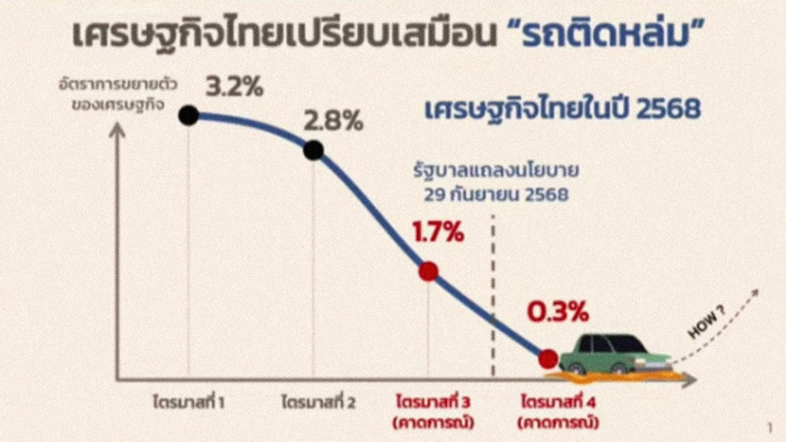 โดยชี้ว่า การส่งออก การบริโภค และการลงทุนจากภาคเอกชน เปรียบเสมือนเครื่องยนต์ที่กำลังจะดับหรือดับไปแล้ว เนื่องจากอัตราการขยายตัวทางเศรษฐกิจของไทยในปีนี้มีการคาดการณ์ว่า จะโตร้อยละ 1.7 ในไตรมาส 3 อาจจะโตเพียงร้อยละ 0.3 ในไตรมาส 4 ฉะนั้นจึงเหลือเพียงการใช้จ่ายของภาครัฐที่เป็นเครื่องยนต์ตัวสุดท้ายที่ยังคงทำงานอยู่