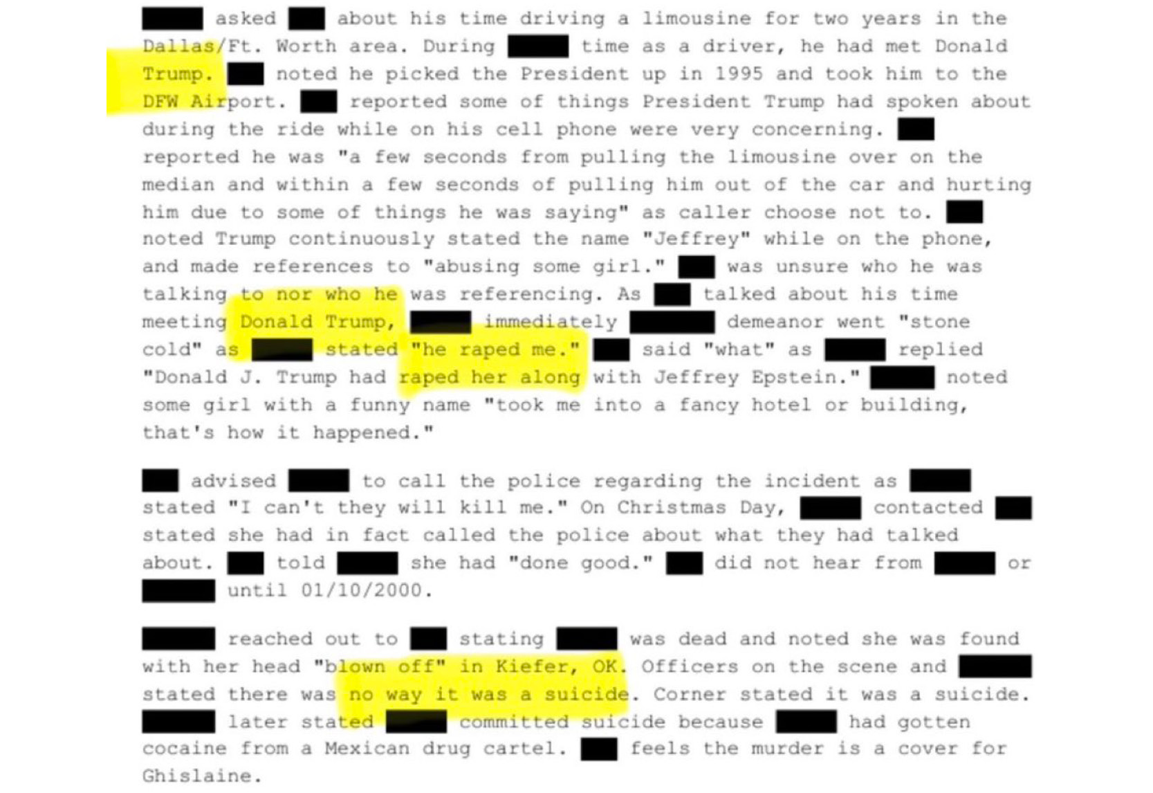 เอกสารฉบับนี้เป็นบันทึกของสำนักงานสอบสวนกลางของสหรัฐฯ (Federal Bureau of Investigation: FBI) ลงบันทึกไว้เมื่อวันที่ 27 ตุลาคม 2022 ซึ่งเป็นบทสนทนากับชายคนหนึ่งที่อ้างตนว่า เป็นคนขับรถลีมูซีนให้กับทรัมป์ในช่วงปี 1995