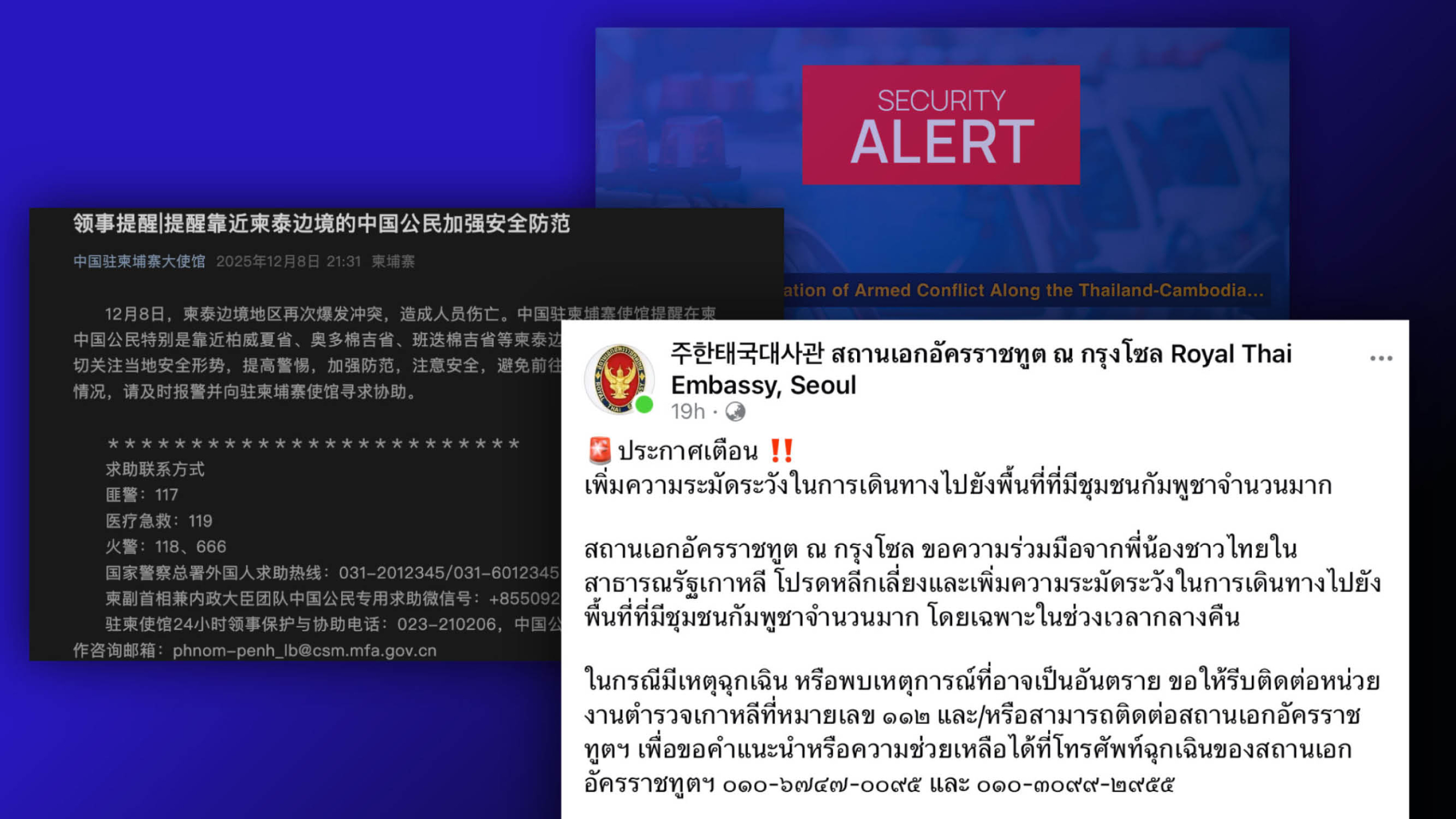เมื่อวานนี้ (8 ธันวาคม 2025) สถานทูตสหรัฐอเมริกาประจำกรุงเทพฯ สถานเอกอัครราชทูต ณ กรุงโซล และสถานทูตจีนประจำกัมพูชา ออกประกาศเตือนประชาชนเกี่ยวกับสถานการณ์การปะทะระหว่างไทย-กัมพูชา หากไม่มีความจำเป็นให้หลีกเลี่ยงการเดินทางไปยังพื้นที่เสี่ยง