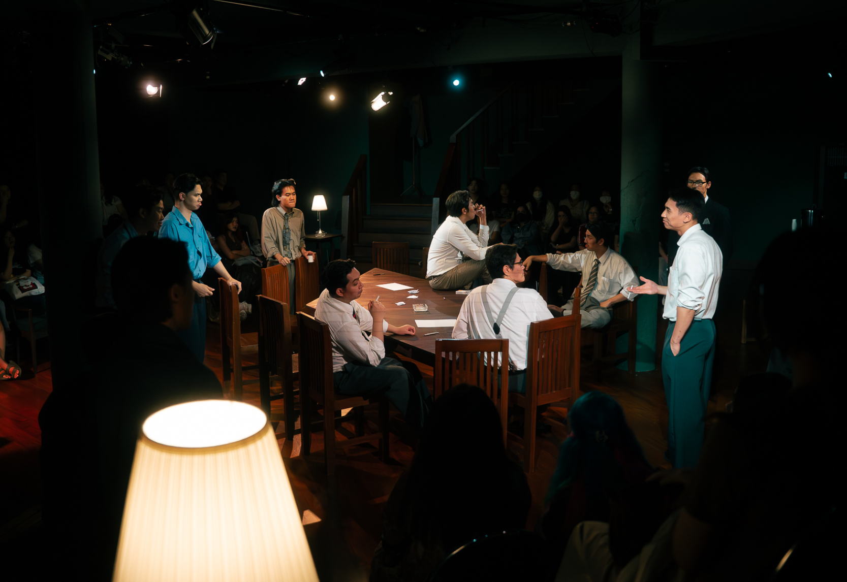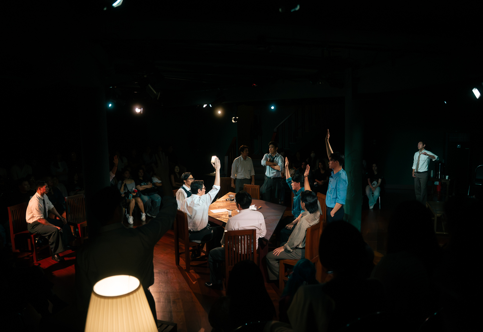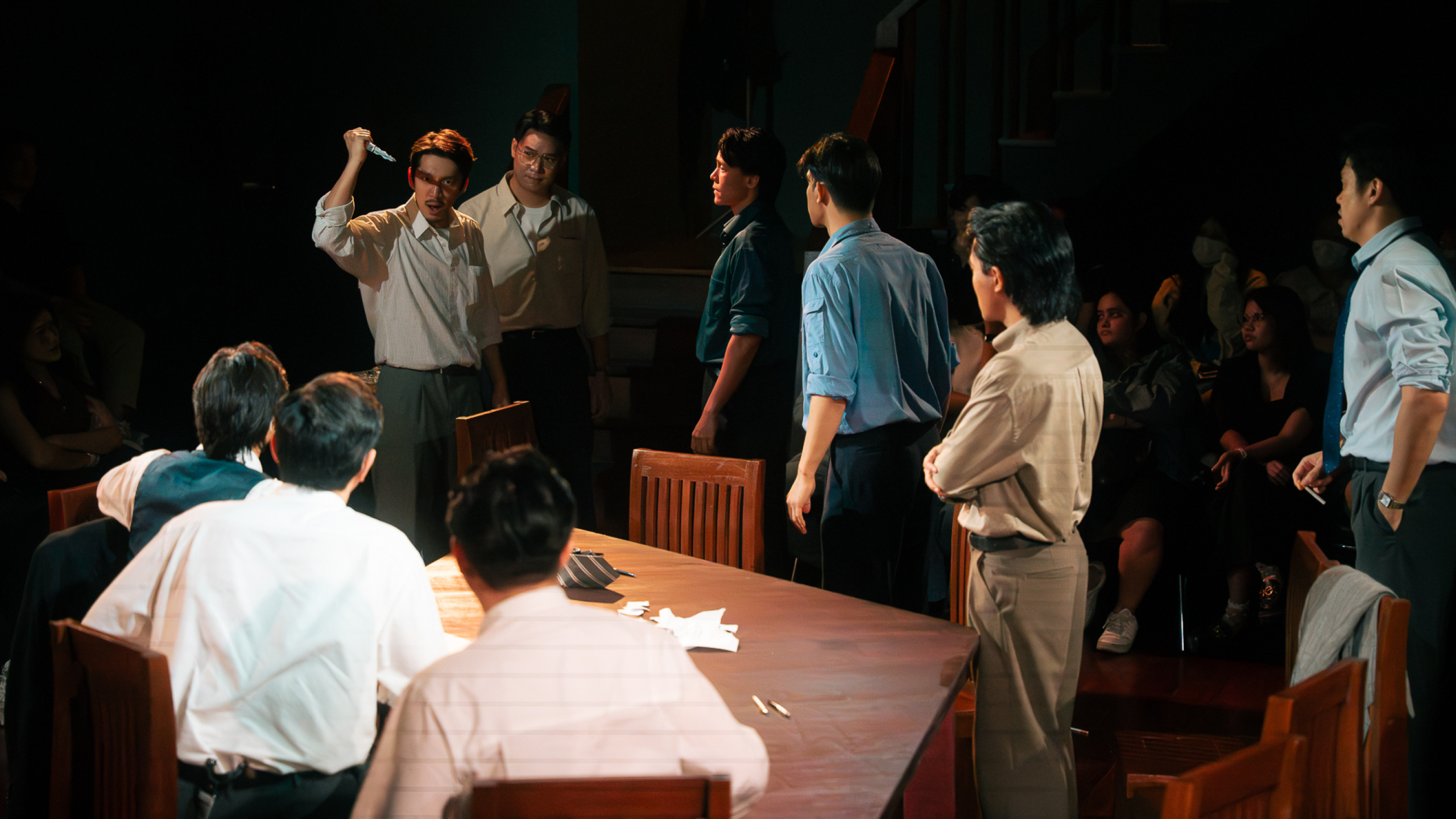 ทว่าปัญหาใหญ่มันไม่ได้อยู่ที่การทำหน้าที่ของนักแสดงชายทั้ง 12 ราย หากมันกลายเป็นการละเลยรายละเอียดในภาพใหญ่ ซึ่งคงจะต้องกล่าวโทษไปที่ผู้กำกับ เมื่อการแสดงในระดับมวลหมู่องค์รวมยังไม่สามารถมี ‘จุดร่วม’ อันสำคัญจำเป็นได้เลย สำหรับใครที่เคยติดตามเนื้อหาจากละครเรื่องนี้มาบ้าง ก็คงจะกระจ่างใจเลยว่า ตัวละครในเรื่องที่ผู้ชมจะต้อง ‘เห็นหน้า’ ปรากฏชัดที่สุด หาใช่บุรุษลูกขุนหมายเลข 3 หรือหมายเลข 8 คู่เห็นต่าง ที่ถูกวางตัวให้เป็นผู้เปิด-ปิดม่านสำหรับทั้งการแสดง หากเขาคือ ‘จำเลยหนุ่ม’ ที่กำลังจะถูกส่งไปยังตะแลงแกง แม้ว่าตลอดทั้งการแสดง เราจะไม่มีโอกาสได้พบเห็นตัวละครรายนี้ ทั้งที่เขาคือบุคคลที่ถูกกล่าวพาดพิงถึงอยู่ตลอดเวลา