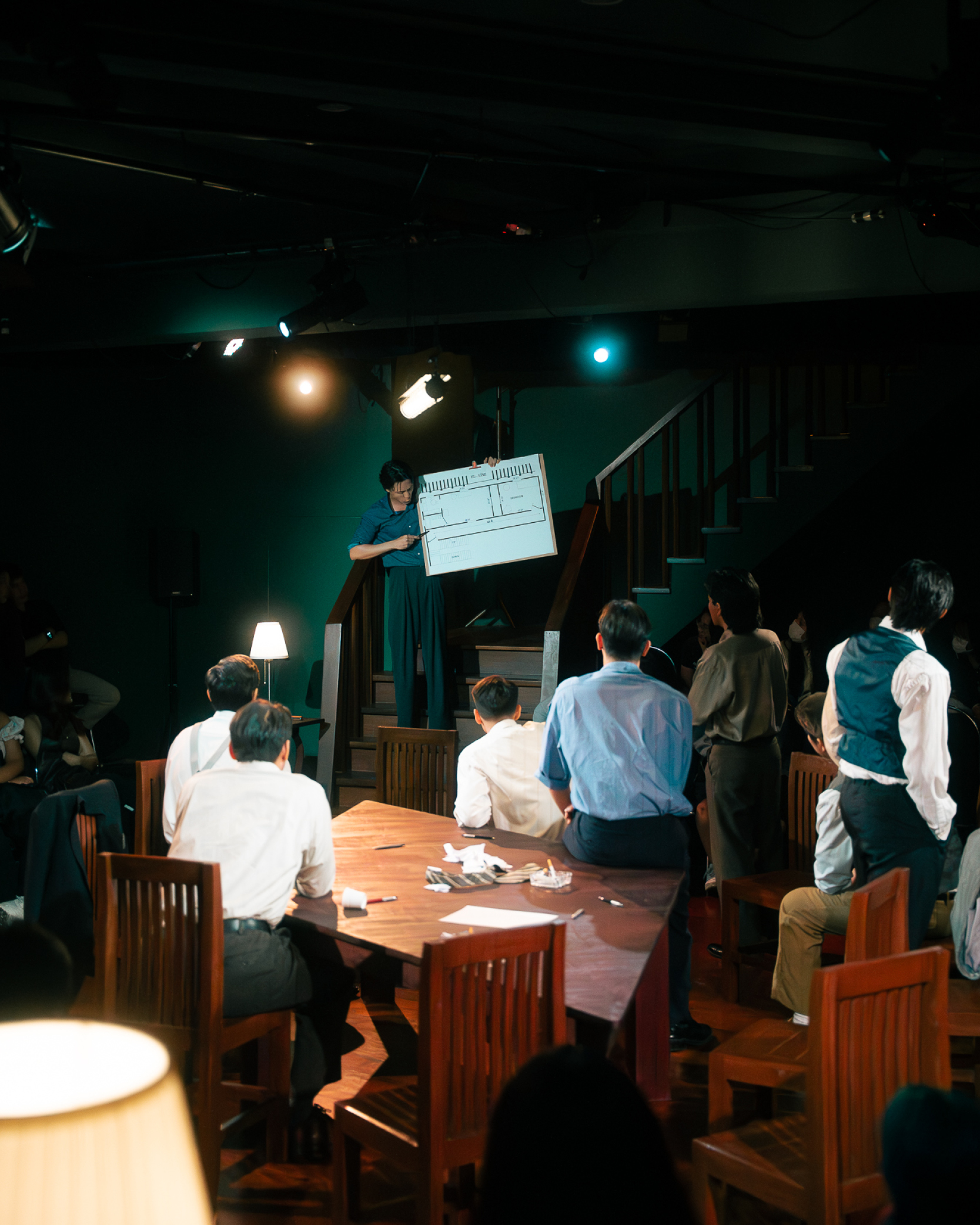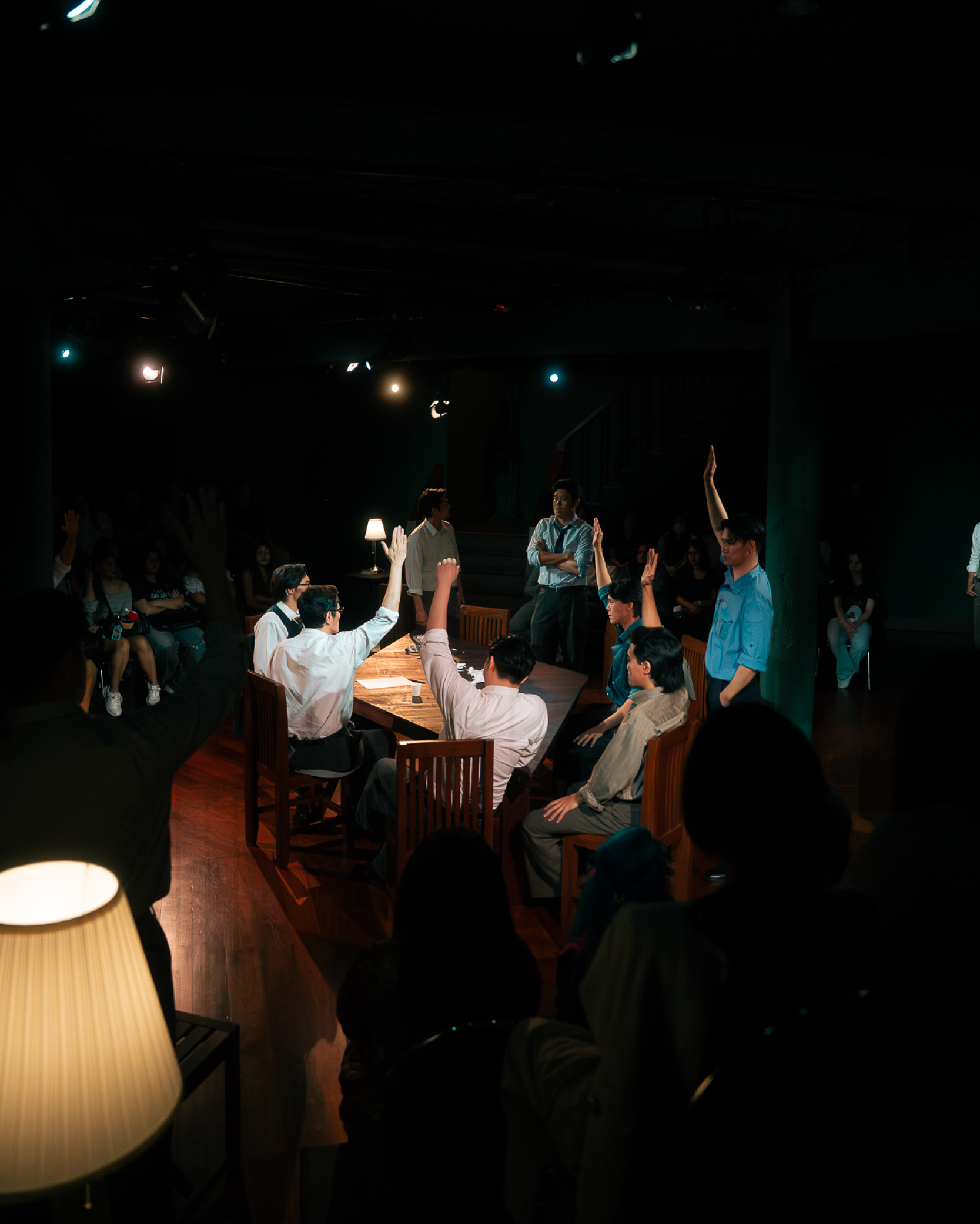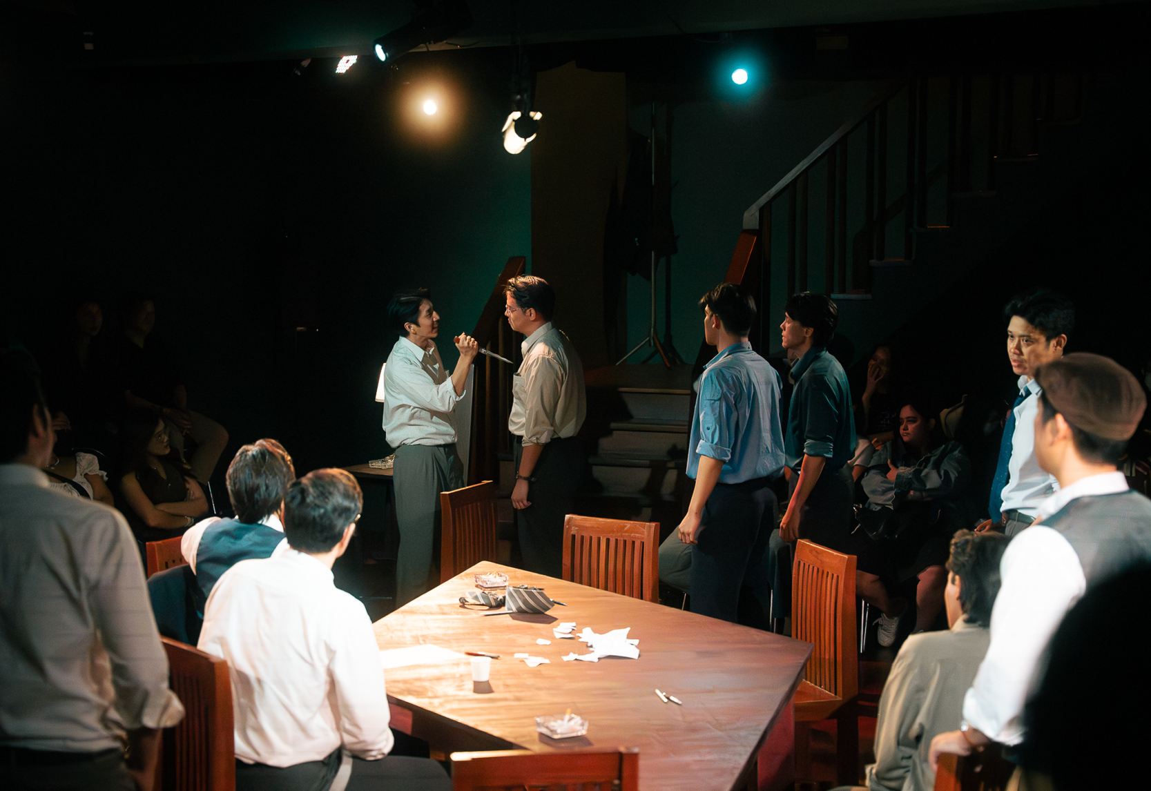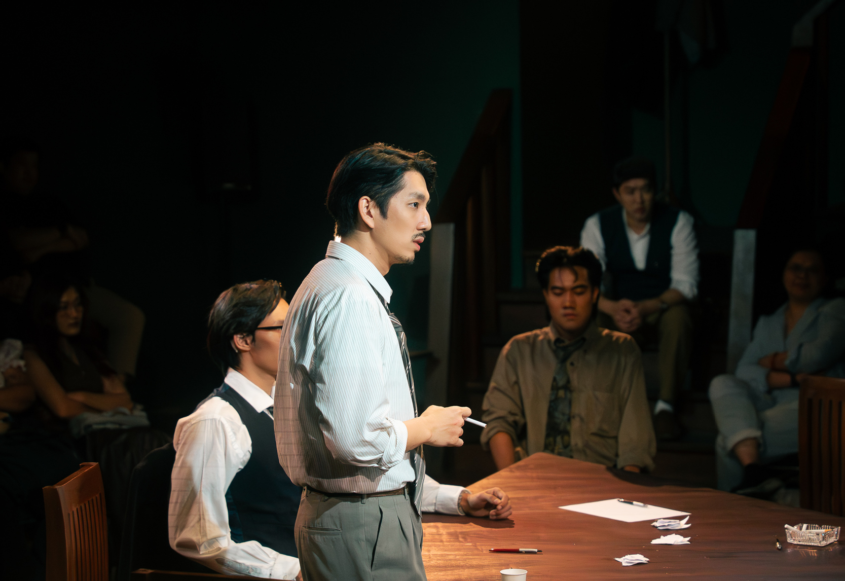 ทว่าปัญหาใหญ่มันไม่ได้อยู่ที่การทำหน้าที่ของนักแสดงชายทั้ง 12 ราย หากมันกลายเป็นการละเลยรายละเอียดในภาพใหญ่ ซึ่งคงจะต้องกล่าวโทษไปที่ผู้กำกับ เมื่อการแสดงในระดับมวลหมู่องค์รวมยังไม่สามารถมี ‘จุดร่วม’ อันสำคัญจำเป็นได้เลย สำหรับใครที่เคยติดตามเนื้อหาจากละครเรื่องนี้มาบ้าง ก็คงจะกระจ่างใจเลยว่า ตัวละครในเรื่องที่ผู้ชมจะต้อง ‘เห็นหน้า’ ปรากฏชัดที่สุด หาใช่บุรุษลูกขุนหมายเลข 3 หรือหมายเลข 8 คู่เห็นต่าง ที่ถูกวางตัวให้เป็นผู้เปิด-ปิดม่านสำหรับทั้งการแสดง หากเขาคือ ‘จำเลยหนุ่ม’ ที่กำลังจะถูกส่งไปยังตะแลงแกง แม้ว่าตลอดทั้งการแสดง เราจะไม่มีโอกาสได้พบเห็นตัวละครรายนี้ ทั้งที่เขาคือบุคคลที่ถูกกล่าวพาดพิงถึงอยู่ตลอดเวลา