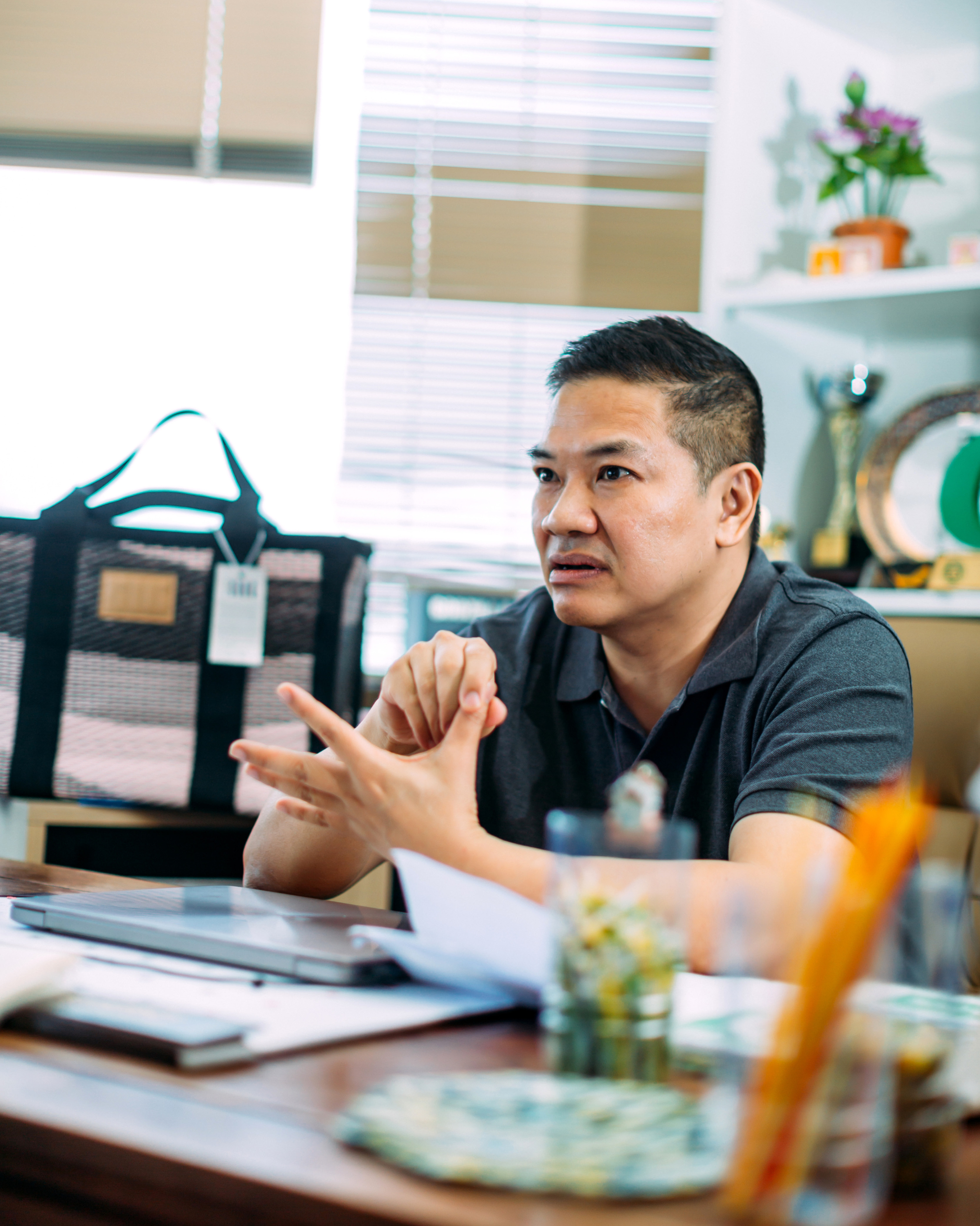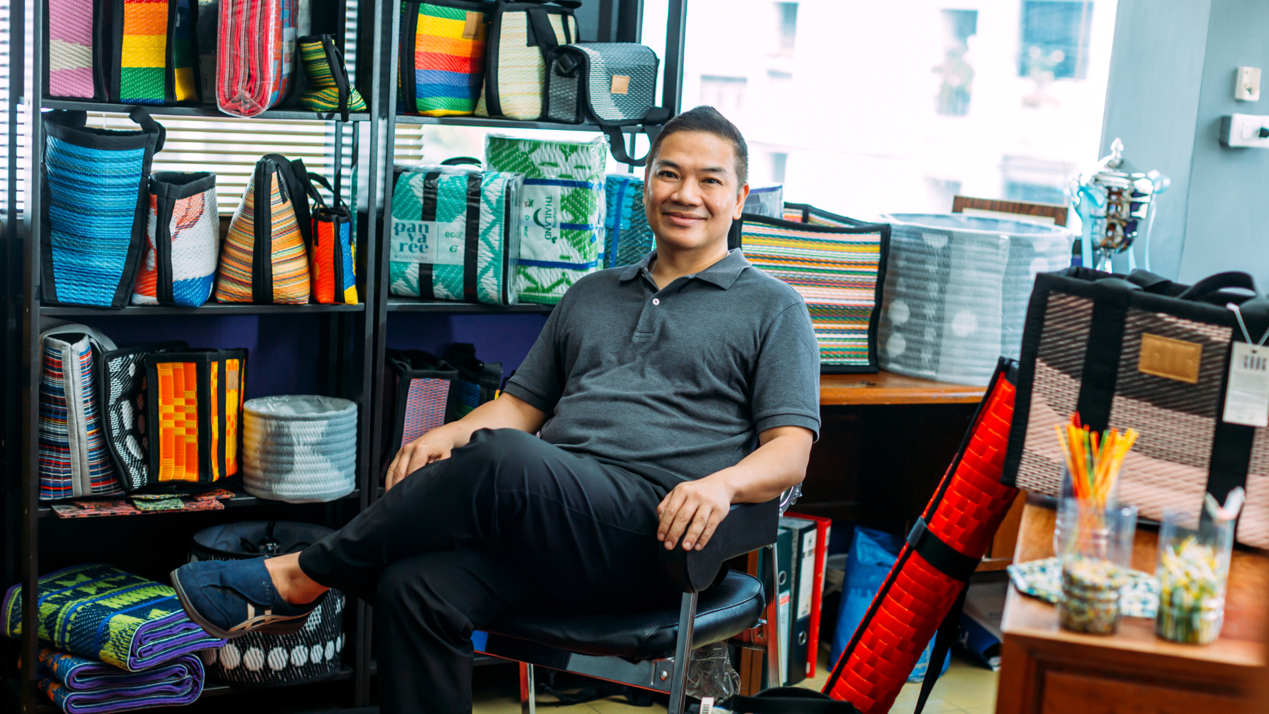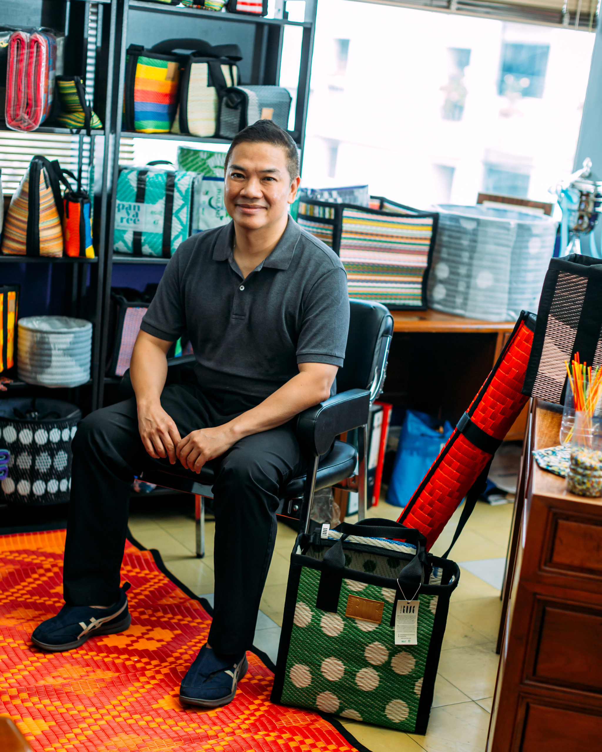 “ผมเข้ามาทำอย่างจริงจังประมาณ 20-30 ปีแล้ว เห็นการเปลี่ยนแปลงเยอะมาก จากเดิมที่ผลิตเพื่อขายอย่างเดียว ตอนนี้ต้องใส่ใจมิติอื่นๆ มากขึ้น โดยเฉพาะเรื่องการถูกดิสรัปต์ซึ่งเสื่อพลาสติกโดนกระทบทั้งระบบ ทั้งจากสินค้าทดแทนอย่างเสื่อจากจีนหรือพรมต่างๆ” เขาเล่าย้อนถึงวันแรกที่เข้ามาสานต่อธุรกิจครอบครัว